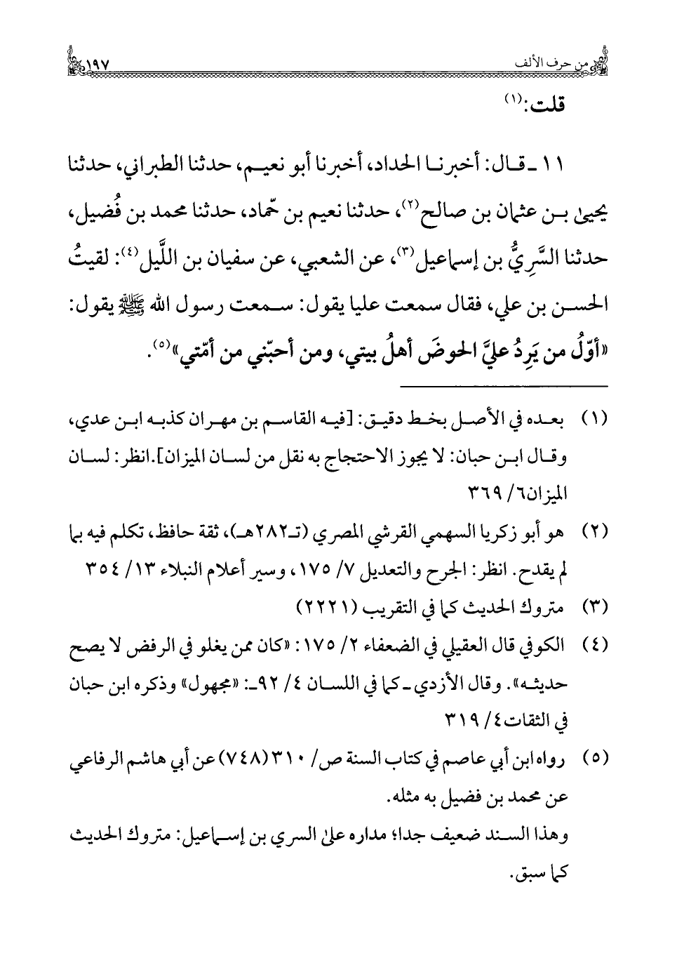 ١١ - قال: أخبرنا الحداد، أخبرنا أبو نعيم، حدثنا الطبراني، حدثنا يحيى بن عثمان بن صالح (¬٢)، حدثنا نعيم بن حّماد، حدثنا محمد بن فُضيل، حدثنا السَّرِيُّ بن إسماعيل (¬٣)، عن الشعبي، عن سفيان بن اللَّيل (¬٤): لقيتُ الحسن بن علي، فقال سمعت عليا يقول: سمعت رسول الله -صلى الله عليه وسلم - يقول: "أوّلُ من يَرِدُ عليّ الحوضَ أهلُ بيتي، ومن أحبّني من أمّتي" (¬٥).