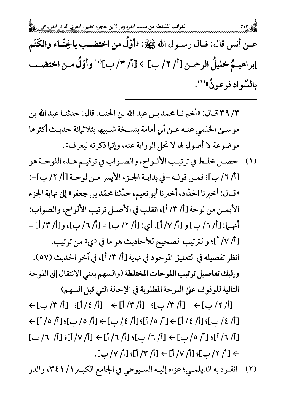 (¬١) حصل خلط في ترتيب الألواح، والصواب في ترقيم هذه اللوحة هو [أ/ ٦/ ب]؛ فمن قوله - في بداية الجزء الأيسر من لوحة [أ/ ٢/ ب]-: "قال: أخبرنا الحدّاد، أخبرنا أبو نعيم، حدّثنا محمّد بن جعفر" إلى نهاية الجزء الأيمن من لوحة [أ/ ٣/ أ]، انقلب في الأصل ترتيب الألواح، والصواب: أنهما: [أ/ ٦/ ب] و [أ/ ٧/ أ]. أي: [أ/ ٢/ ب] = [أ / ٦/ ب]، و [أ / ٣/ أ] = [أ/ ٧/ أ]؛ والترتيب الصحيح للأحاديث هو ما في "ي" من ترتيب.
