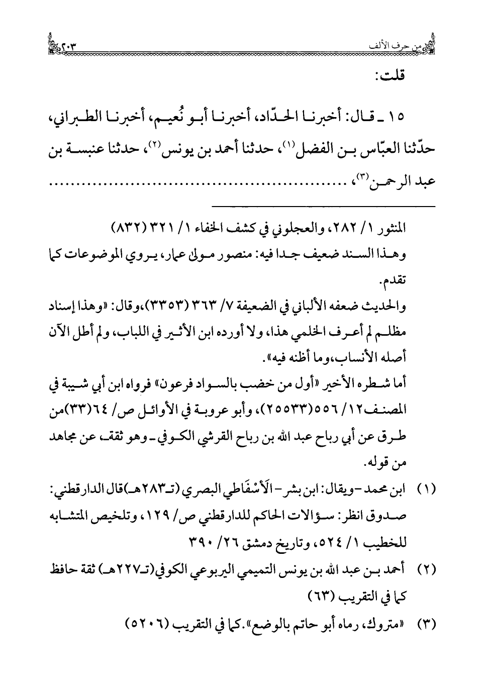 ١٥ - قال: أخبرنا الحدّاد، أخبرنا أبو نُعيم، أخبرنا الطبراني، حدّثنا العبّاس بن الفضل (¬١)، حدثنا أحمد بن يونس (¬٢)، حدثنا عنبسة بن عبد الرحمن (¬٣)، ...... ...... ...... ...... ...... ...... ...... ...... ...... .