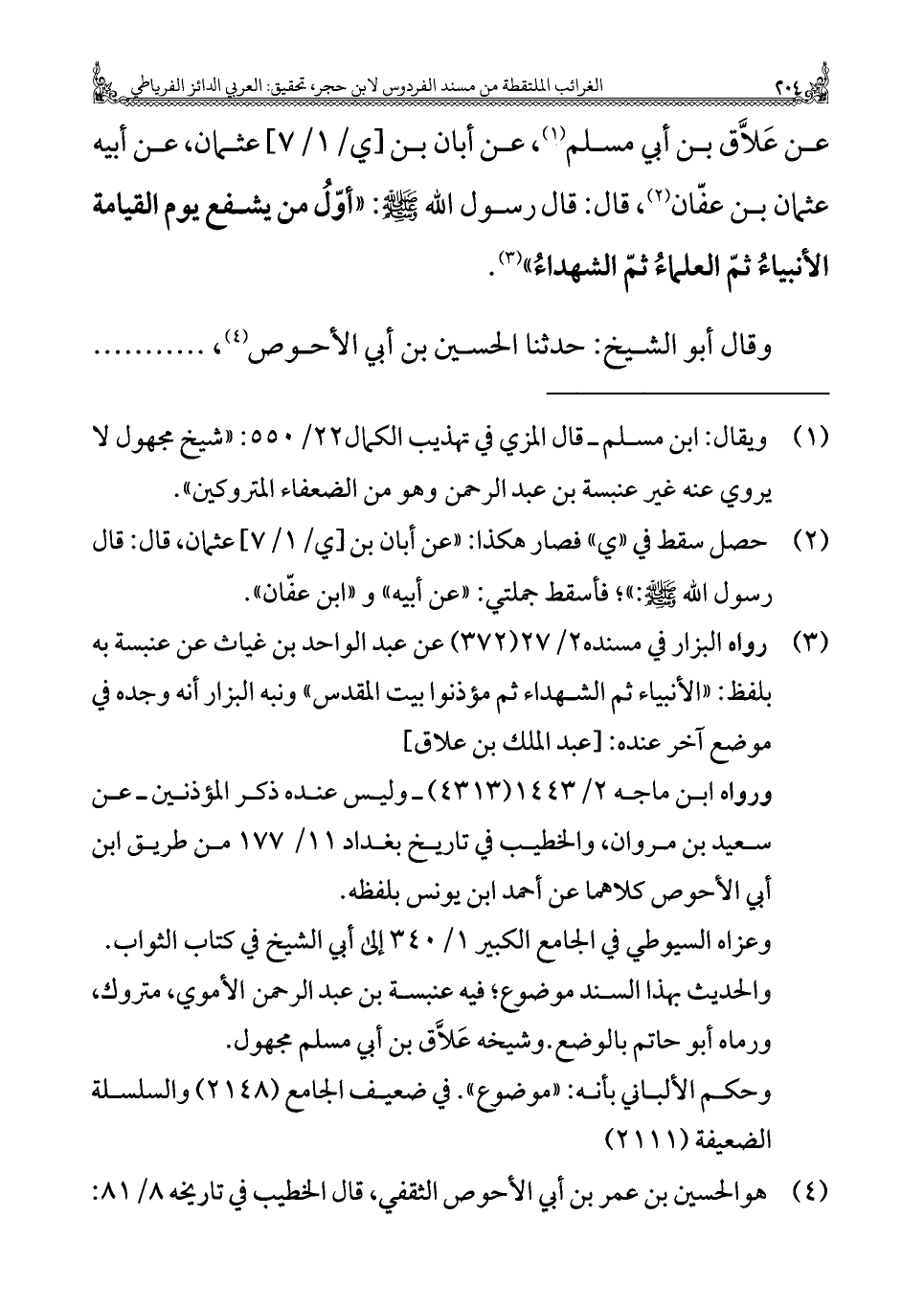 (¬١) ويقال: ابن مسلم - قال المزي في تهذيب الكمال ٢٢/ ٥٥٠: "شيخ مجهول لا يروي عنه غير عنبسة بن عبد الرحمن وهو من الضعفاء المتروكين".