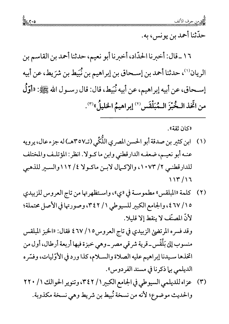 ١٦ - قال: أخبرنا الحدّاد، أخبرنا أبو نعيم، حدثنا أحمد بن القاسم بن الريان (¬١)، حدثنا أحمد بن إسحاق بن إبراهيم بن نُبَيط بن شرَيط، عن أبيه إسحاق، عن أبيه إبراهيم، عن أبيه نُبَيط، قال: قال رسول الله - صلى الله عليه وسلم -: "أوّلُ من اتّخذ الخُبْزَ المُبَلْقَس (¬٢) إبراهيمُ الخليلُ" (¬٣).