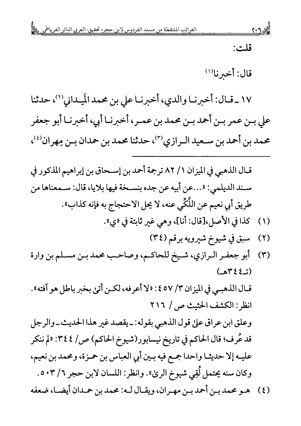 ١٧ - قال: أخبرنا والدي، أخبرنا علي بن محمد المَيداني (¬٢)، حدثنا علي بن عمر بن أحمد بن محمد بن عمر، أخبرنا أبي، أخبرنا أبو جعفر محمد بن أحمد بن سعيد الرازي (¬٣)، حدثنا محمد بن حمدان بن مِهران (¬٤)،
