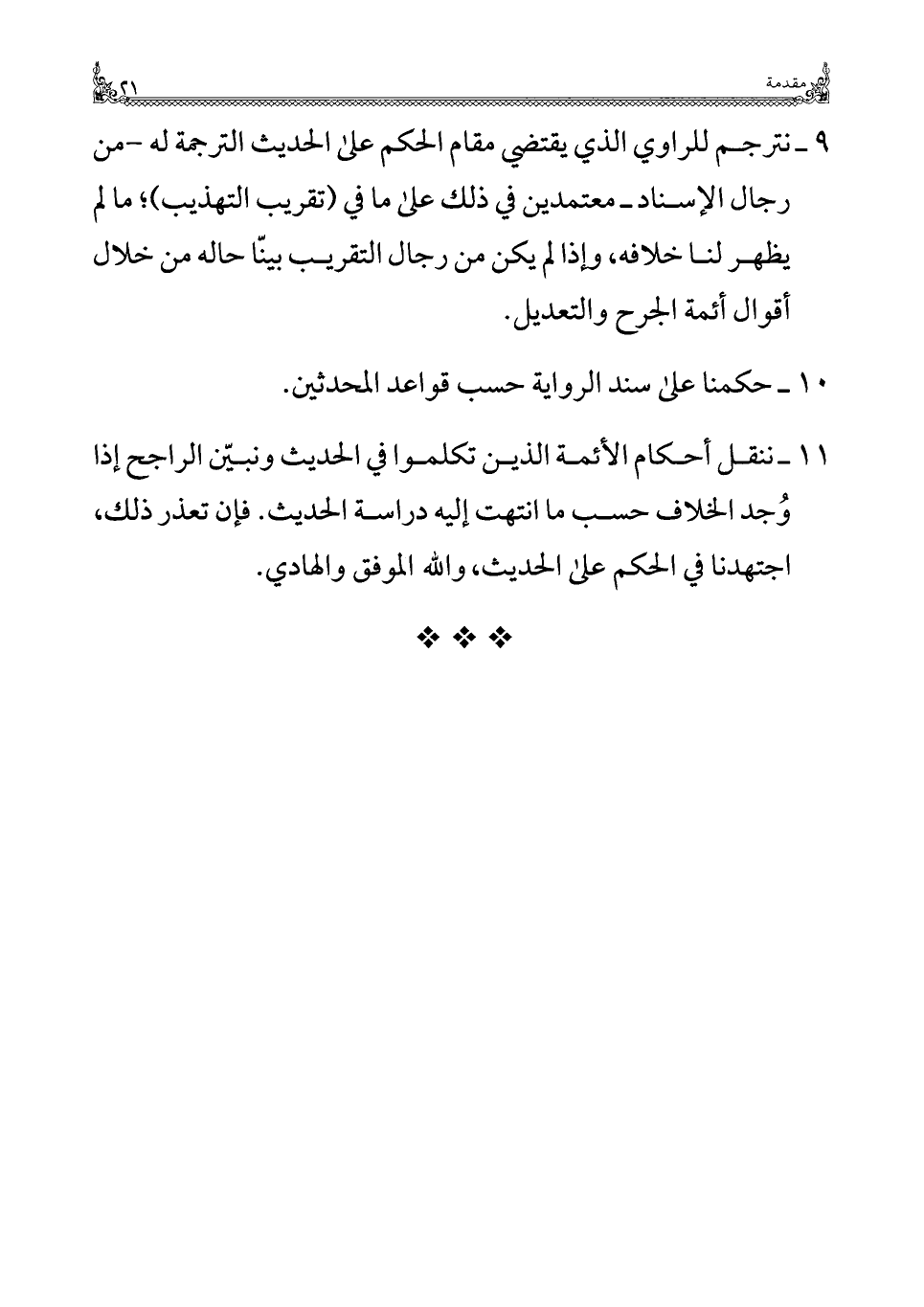 ١١ - ننقل أحكام الأئمة الذين تكلموا في الحديث ونبيّن الراجح إذا وُجد الخلاف حسب ما انتهت إليه دراسة الحديث. فإن تعذر ذلك، اجتهدنا في الحكم على الحديث، والله الموفق والهادي.