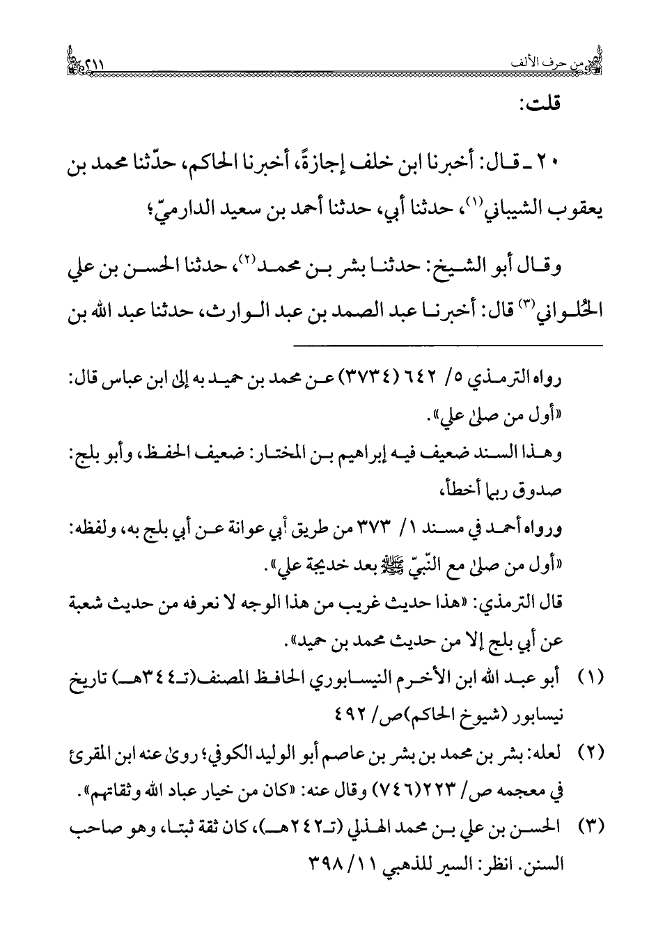 ورواه أحمد في مسند ١/ ٣٧٣ من طريق أبي عوانة عن أبي بلج به، ولفظه: "أول من صلى مع النّبيّ - صلى الله عليه وسلم - بعد خديجة علي".