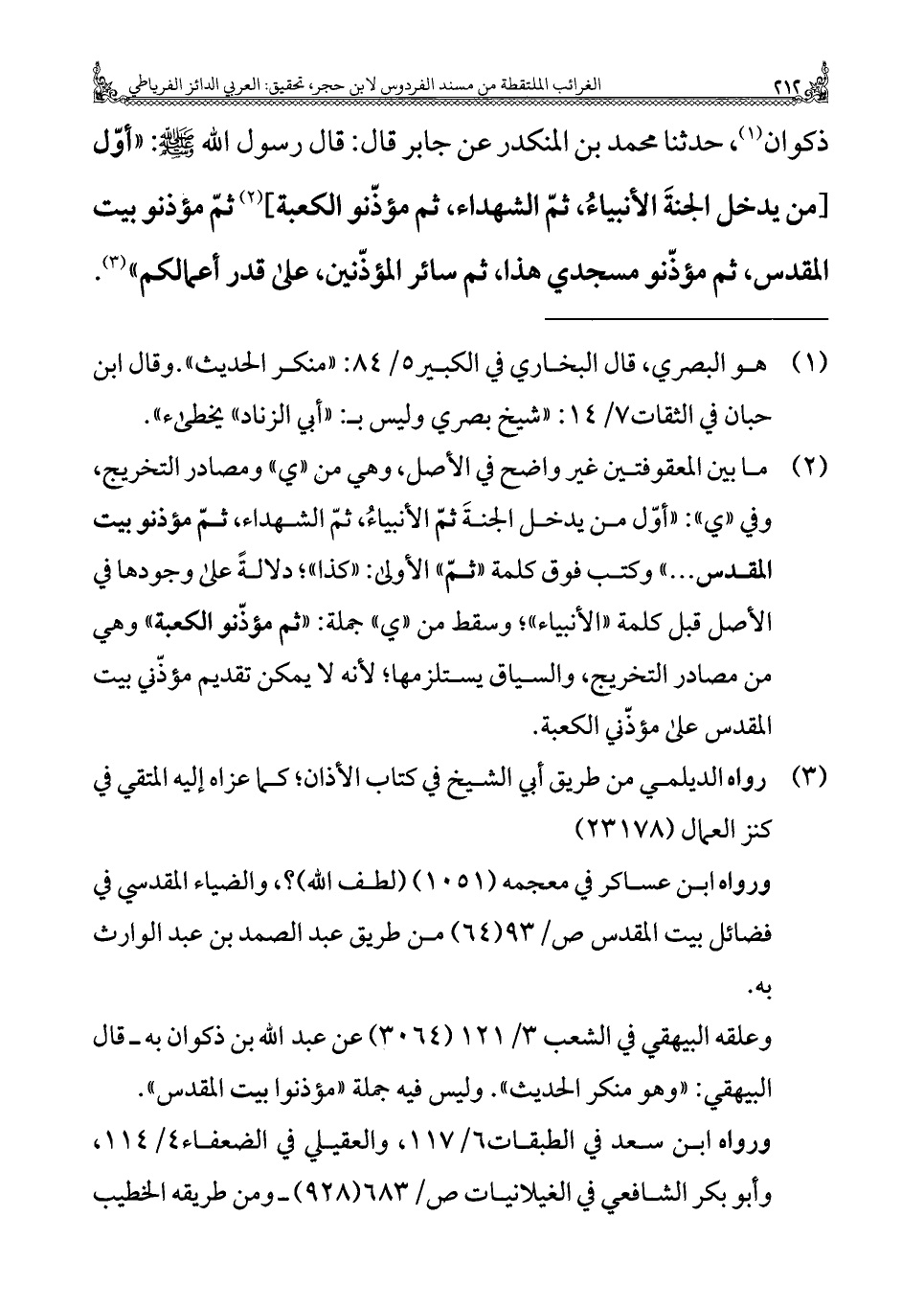 ذكوان (¬١)، حدثنا محمد بن المنكدر عن جابر قال: قال رسول الله - صلى الله عليه وسلم -: "أوّل [من يدخل الجنةَ الأنبياءُ، ثمّ الشهداء، ثم مؤذّنو الكعبة] (¬٢) ثمّ مؤذنو بيت المقدس، ثم مؤذّنو مسجدي هذا، ثم سائر المؤذّنين، على قدر أعمالكم" (¬٣).