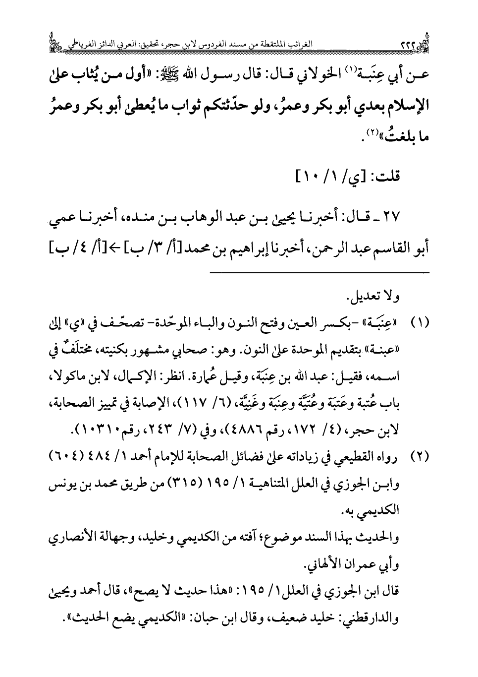 (¬١) "عِنَبَة" - بكسر العين وفتح النون والباء الموحّدة - تصحّف في "ي" إلى "عبنة" بتقديم الموحدة على النون. وهو: صحابي مشهور بكنيته، مختلَفٌ في اسمه، فقيل: عبد الله بن عِنَبَة، وقيل عُمارة. انظر: الإكمال، لابن ماكولا، باب عُتبة وعَتبَة وعُتَيَّة وعِنَبَة وغَنِيَّة، (٦/ ١١٧)، الإصابة في تمييز الصحابة، لابن حجر، (٤/ ١٧٢، رقم ٤٨٨٦)، وفي (٧/ ٢٤٣، رقم ١٠٣١٠).