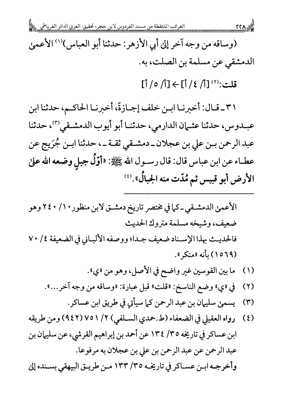 ٣١ - قال: أخبرنا ابن خلف إجازةً، أخبرنا الحاكم، حدثنا ابن عبدوس، حدثنا عثمان الدارمي، حدثنا أبو أيوب الدمشقي (¬٣)، حدثنا عبد الرحمن بن علي بن عجلان - دمشقي ثقة -، حدثنا ابن جُرَيج عن عطاء عن ابن عباس قال: قال رسول الله - صلى الله عليه وسلم -: "أوّلُ جبلٍ وضعه الله على الأرض أبو قبيس ثم مُدّت منه الجبالُ". (¬٤)
