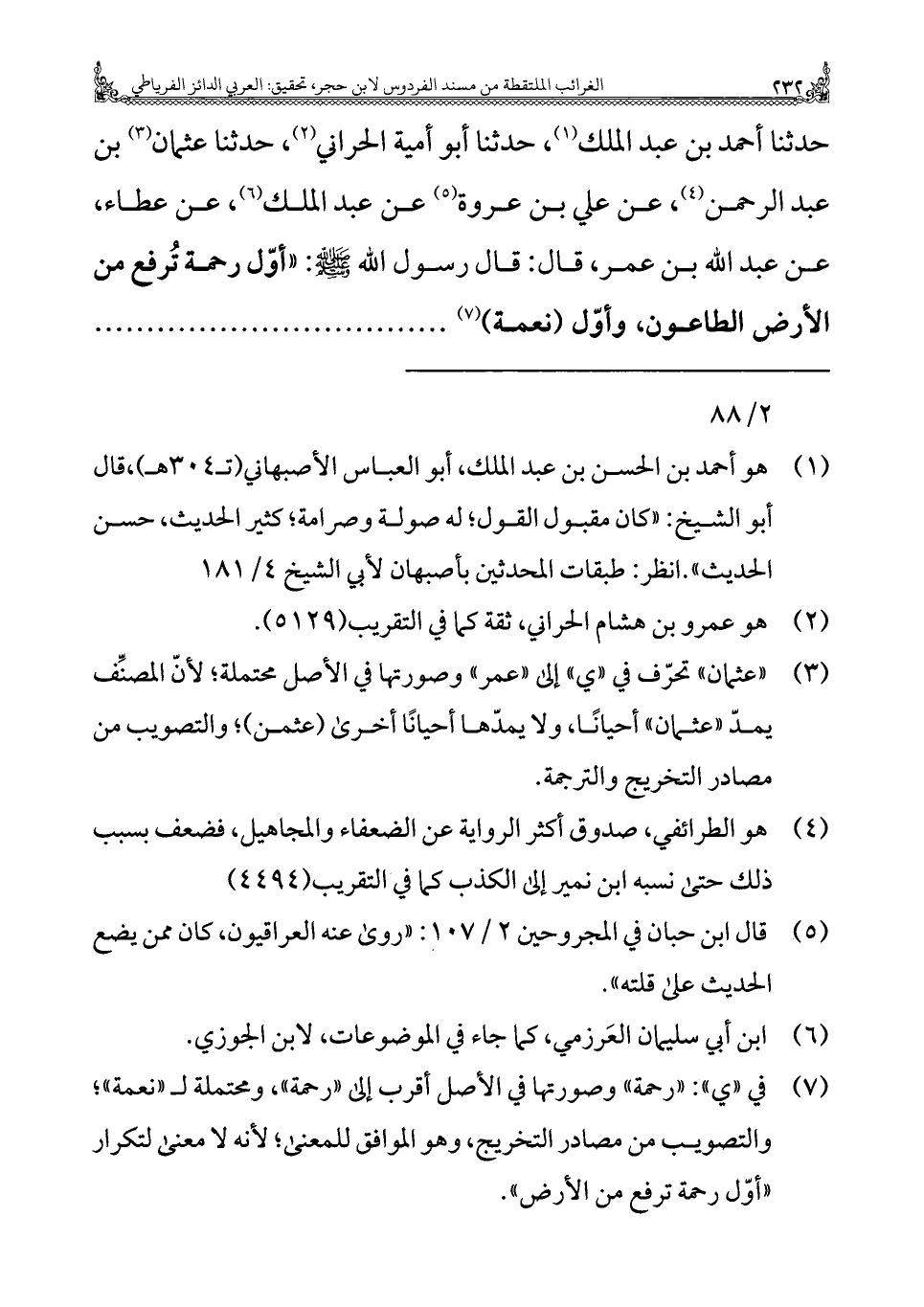 (¬٣) "عثمان" تحرّف في "ي" إلى "عمر" وصورتها في الأصل محتملة؛ لأنّ المصنِّف يمدّ "عثمان" أحيانًا، ولا يمدّها أحيانًا أخرى (عثمن)؛ والتصويب من مصادر التخريج والترجمة.