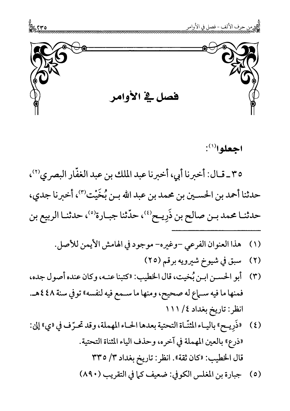 ٣٥ - قال: أخبرنا أبي، أخبرنا عبد الملك بن عبد الغفّار البصري (¬٢)، حدثنا أحمد بن الحسين بن محمد بن عبد الله بن بُخَيْت (¬٣)، أخبرنا جدي، حدثنا محمد بن صالح بن ذَرِيح (¬٤)، حدّثنا جبارة (¬٥)، حدثنا الربيع بن