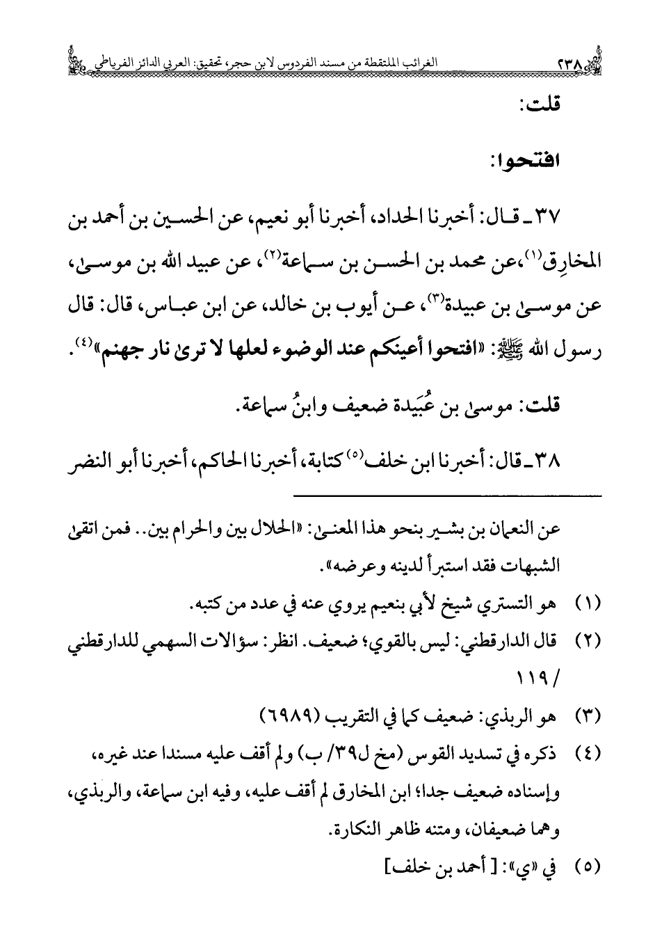 ٣٧ - قال: أخبرنا الحداد، أخبرنا أبو نعيم، عن الحسين بن أحمد بن المخارِق (¬١)، عن محمد بن الحسن بن سماعة (¬٢)، عن عبيد الله بن موسى، عن موسى بن عبيدة (¬٣)، عن أيوب بن خالد، عن ابن عباس، قال: قال رسول الله - صلى الله عليه وسلم -: "افتحوا أعينَكم عند الوضوء لعلها لا ترى نار جهنم" (¬٤).