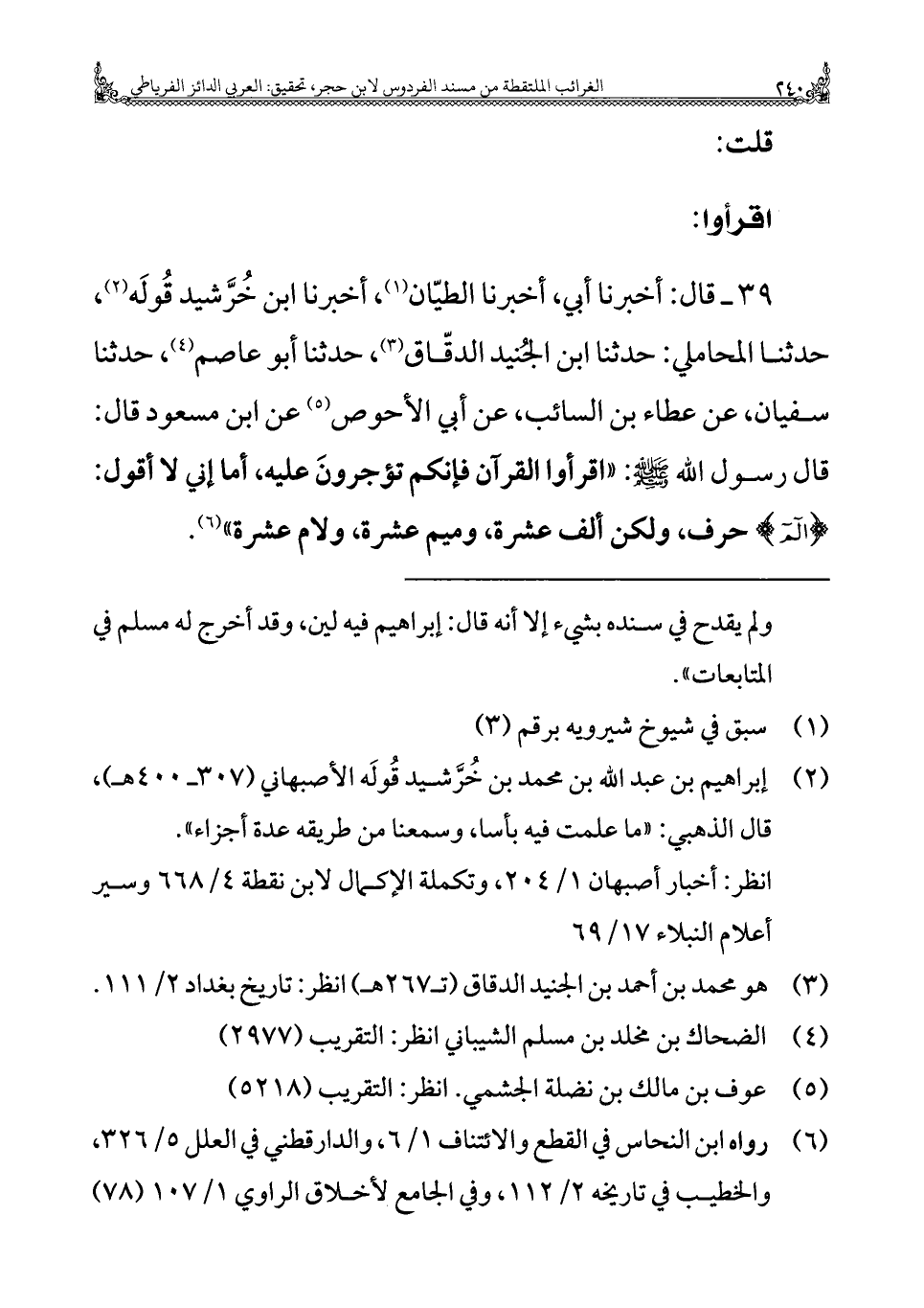 ٣٩ - قال: أخبرنا أبي، أخبرنا الطيّان (¬١)، أخبرنا ابن خُرَّشيد قُولَه (¬٢)، حدثنا المحاملي: حدثنا ابن الجُنيد الدقّاق (¬٣)، حدثنا أبو عاصم (¬٤)، حدثنا سفيان، عن عطاء بن السائب، عن أبي الأحوص (¬٥) عن ابن مسعود قال: قال رسول الله - صلى الله عليه وسلم -: "اقرأوا القرآن فإنكم تؤجرونَ عليه، أما إني لا أقول: {الم} حرف، ولكن ألف عشرة، وميم عشرة، ولام عشرة" (¬٦).