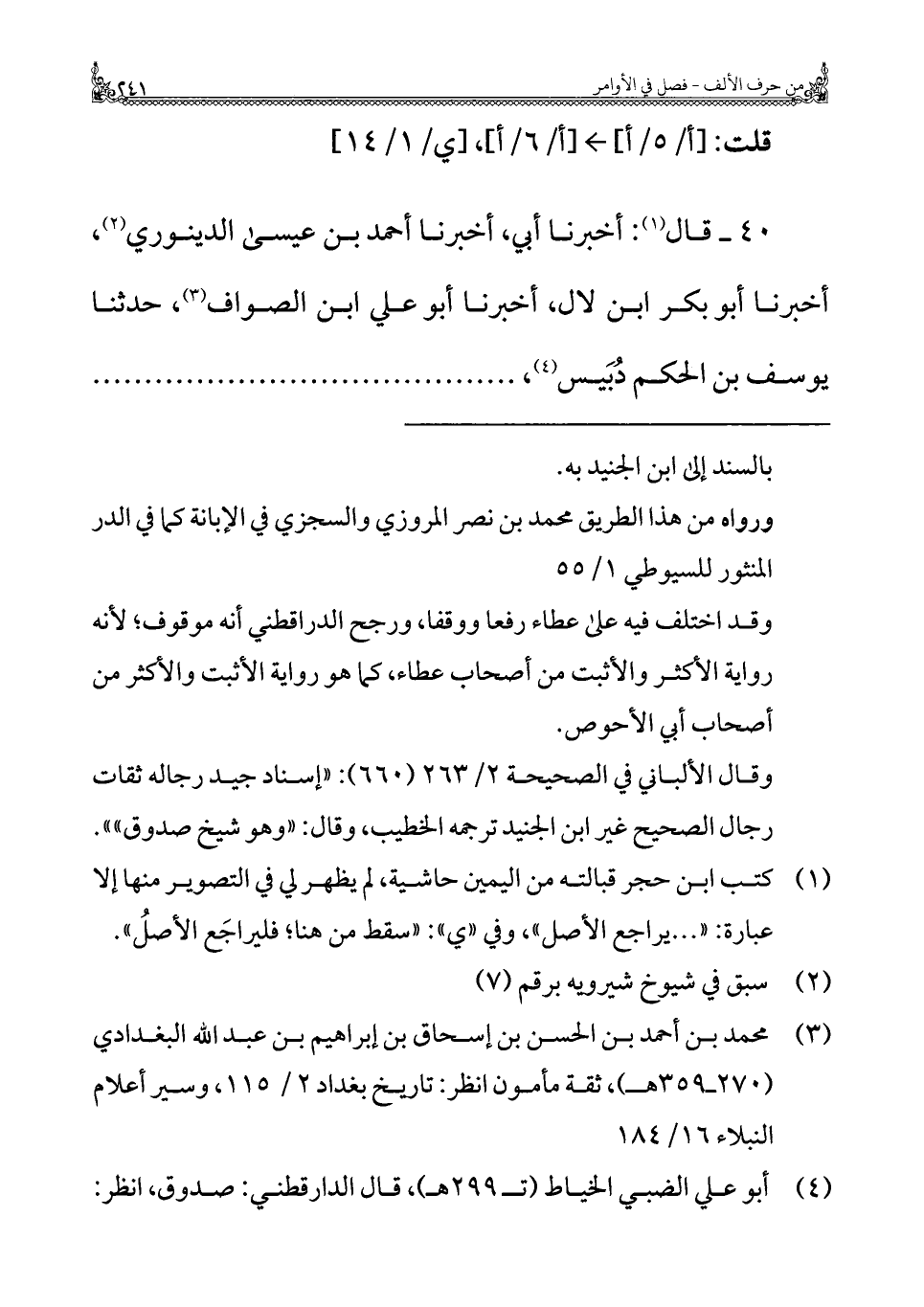 ٤٠ - قال (¬١): أخبرنا أبي، أخبرنا أحمد بن عيسى الدينوري (¬٢)، أخبرنا أبو بكر بن لال، أخبرنا أبو علي ابن الصواف (¬٣)، حدثنا يوسف بن الحكم دُبَيس (¬٤)، ...... ...... ...... ...... ...... ......... ..