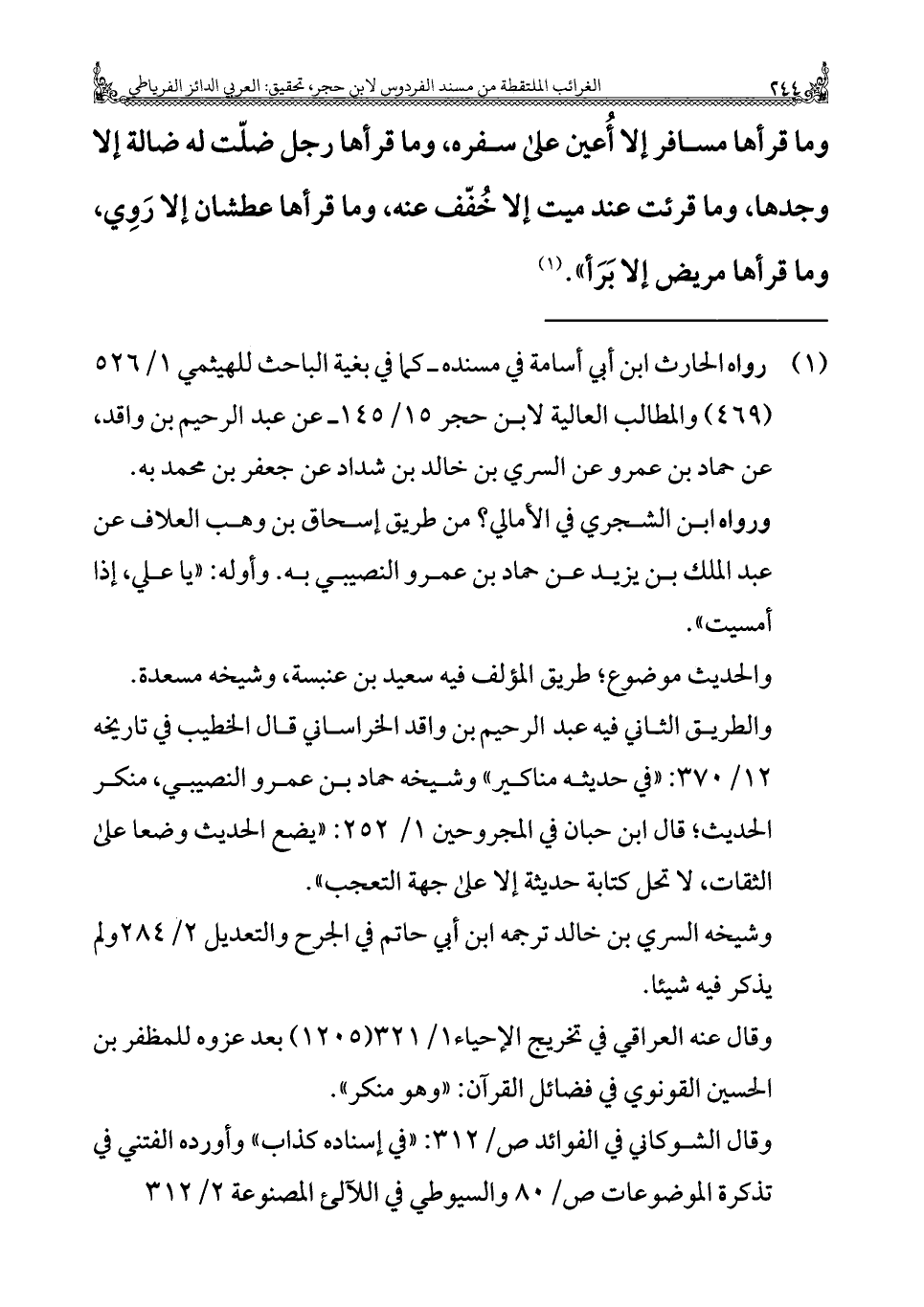 (¬١) رواه الحارث ابن أبي أسامة في مسنده - كما في بغية الباحث للهيثمي ١/ ٥٢٦ (٤٦٩) والمطالب العالية لابن حجر ١٥/ ١٤٥ - عن عبد الرحيم بن واقد، عن حماد بن عمرو عن السري بن خالد بن شداد عن جعفر بن محمد به.