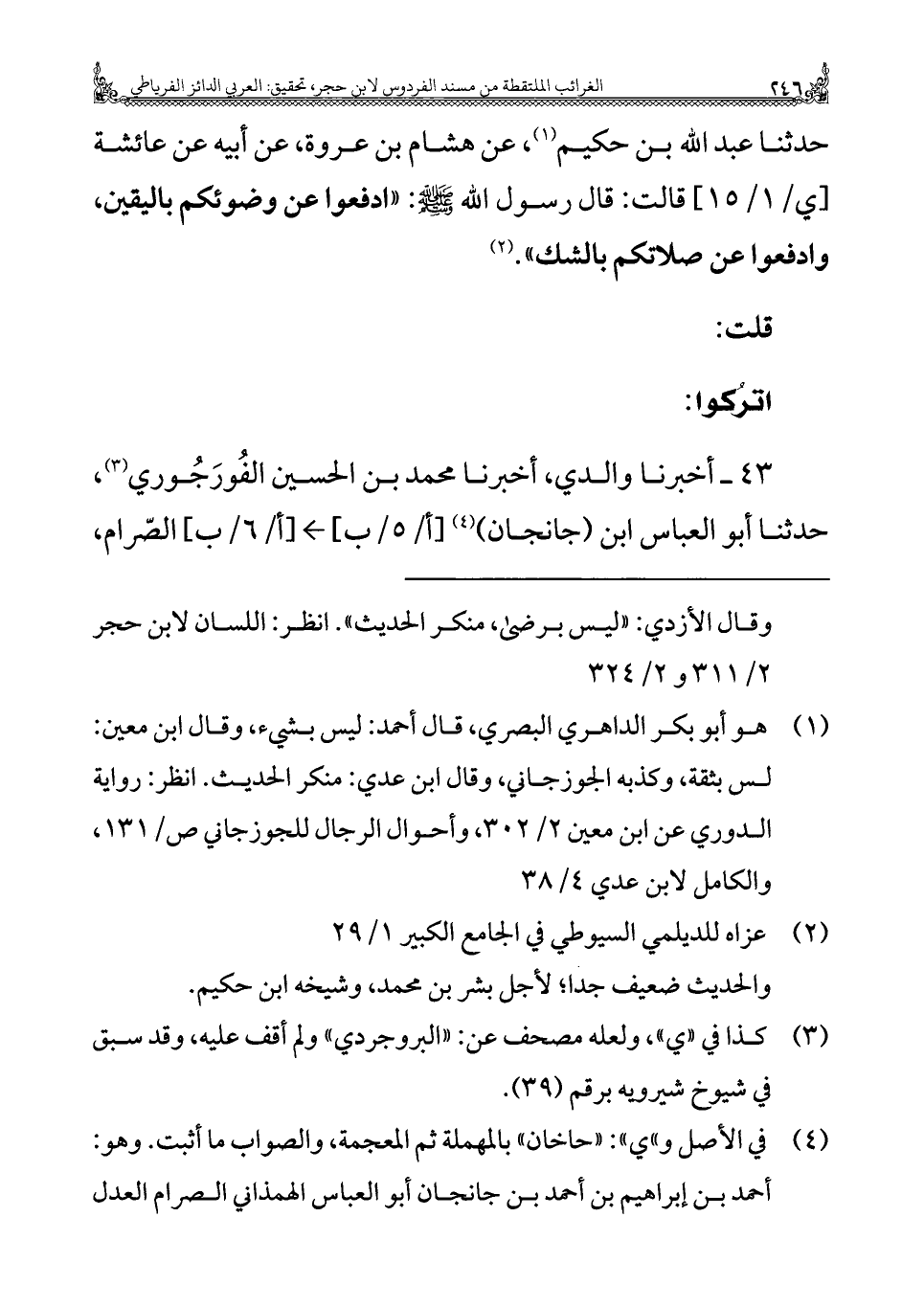 حدثنا عبد الله بن حكيم (¬١)، عن هشام بن عروة، عن أبيه عن عائشة [ي/ ١/ ١٥] قالت: قال رسول الله - صلى الله عليه وسلم -: "ادفعوا عن وضوئكم باليقين، وادفعوا عن صلاتكم بالشك". (¬٢)