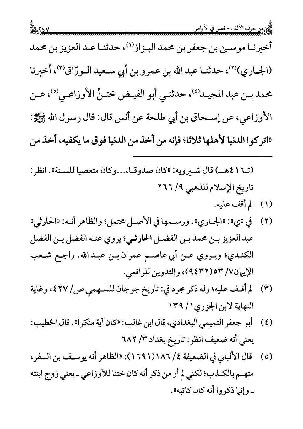 (¬٢) في "ي": "الجاري"، ورسمها في الأصل محتمل؛ والظاهر أنه: "الحارثي" عبد العزيز بن محمد بن الفضل الحارثي؛ يروي عنه الفضل بن الفضل الكندي؛ ويروي عن أبي عاصم عمران بن عبد الله. راجع شعب الإيمان ٧/ ٥٣ (٩٤٣٢)، والتدوين للرافعي.