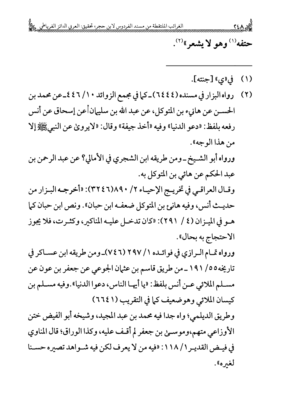 (¬٢) رواه البزار في مسنده (٦٤٤٤) - كما في مجمع الزوائد ١٠/ ٤٤٦ - عن محمد بن الحسن عن هانئ بن المتوكل، عن عبد الله بن سليمان عن إسحاق عن أنس رفعه بلفظ: "دعو الدنيا" وفيه "أخذ جيفة" وقال: "لا يروى عن النبي - صلى الله عليه وسلم - إلا من هذا الوجه".