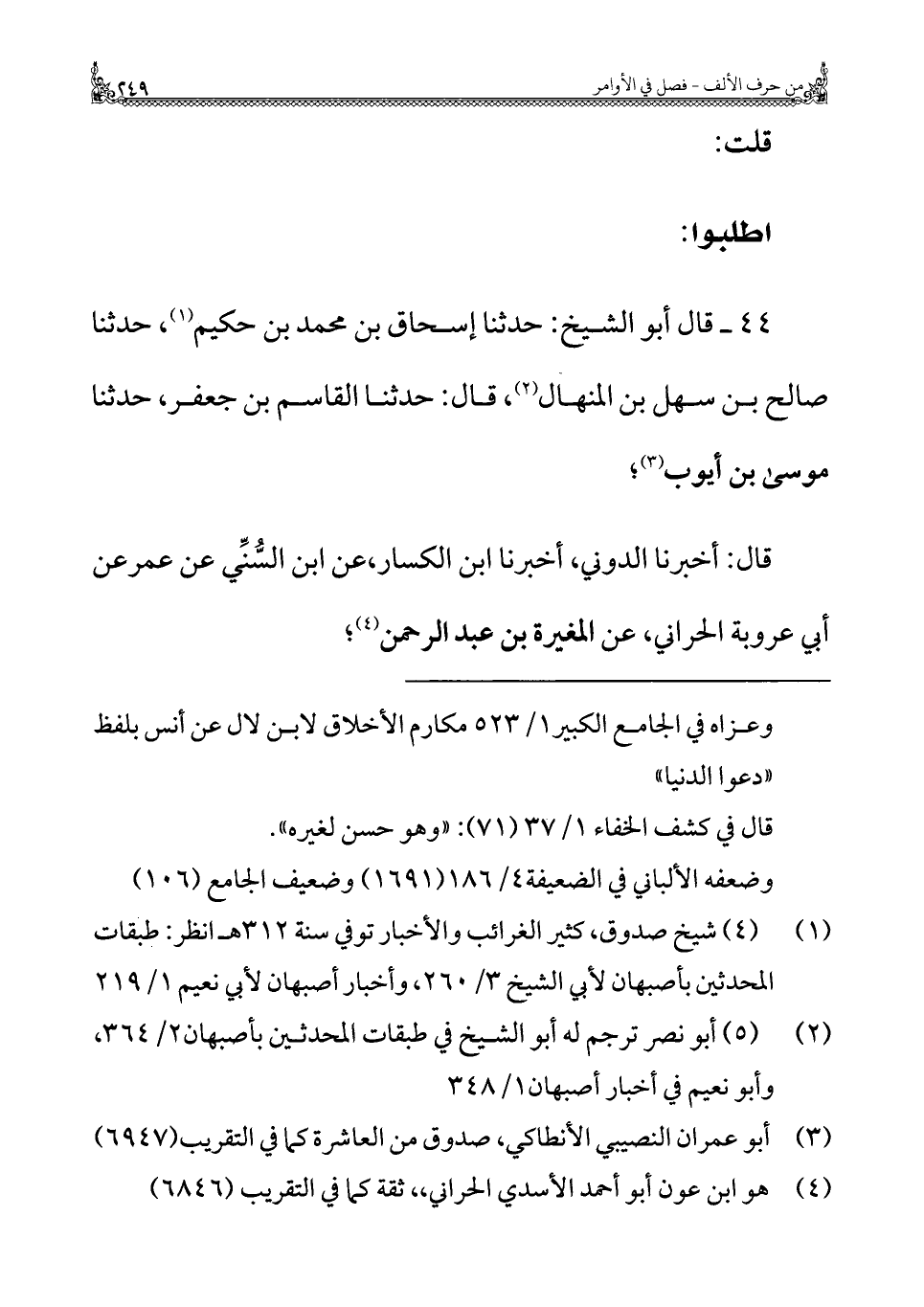 (¬١) (٤) شيخ صدوق، كثير الغرائب والأخبار توفي سنة ٣١٢ هـ انظر: طبقات المحدثين بأصبهان لأبي الشيخ ٣/ ٢٦٠، وأخبار أصبهان لأبي نعيم ١/ ٢١٩.