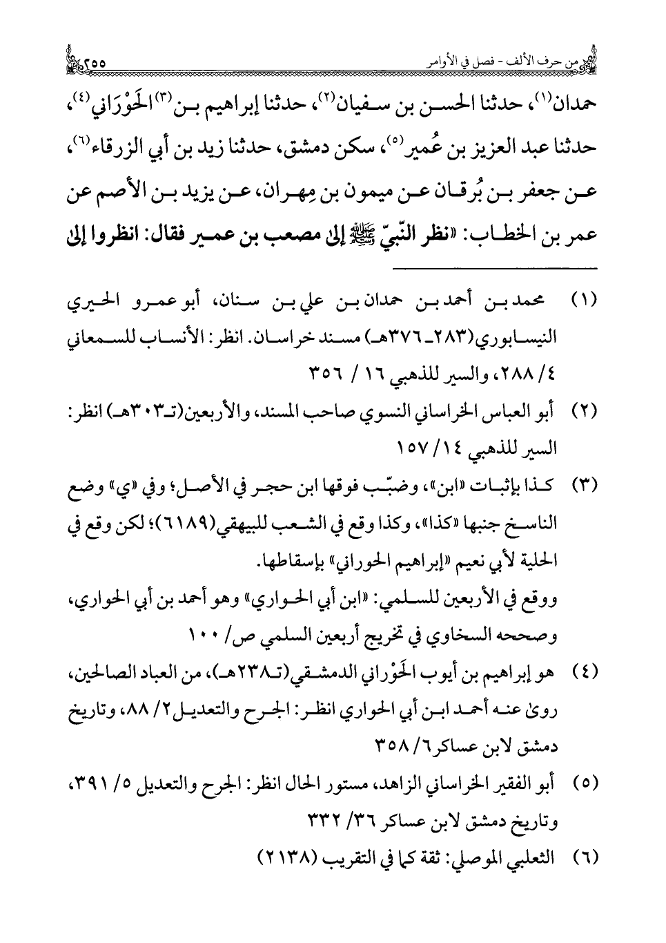حمدان (¬١)، حَدَّثَنَا الحسن بن سفيان (¬٢)، حَدَّثَنَا إبراهيم بن (¬٣) الحَوْرَاني (¬٤)، حَدَّثَنَا عبد العزيز بن عُمير (¬٥)، سكن دمشق، حَدَّثَنَا زيد بن أبي الزرقاء (¬٦)، عن جعفر بن بُرقان عن ميمون بن مِهِرّان، عن يزيد بن الأصم عن عمر بن الخطاب: "نظر النّبيّ - صَلَّى اللهُ عَلَيْهِ وَسَلَّمَ - إِلَى مصعب بن عمير فقال: انظروا إِلَى