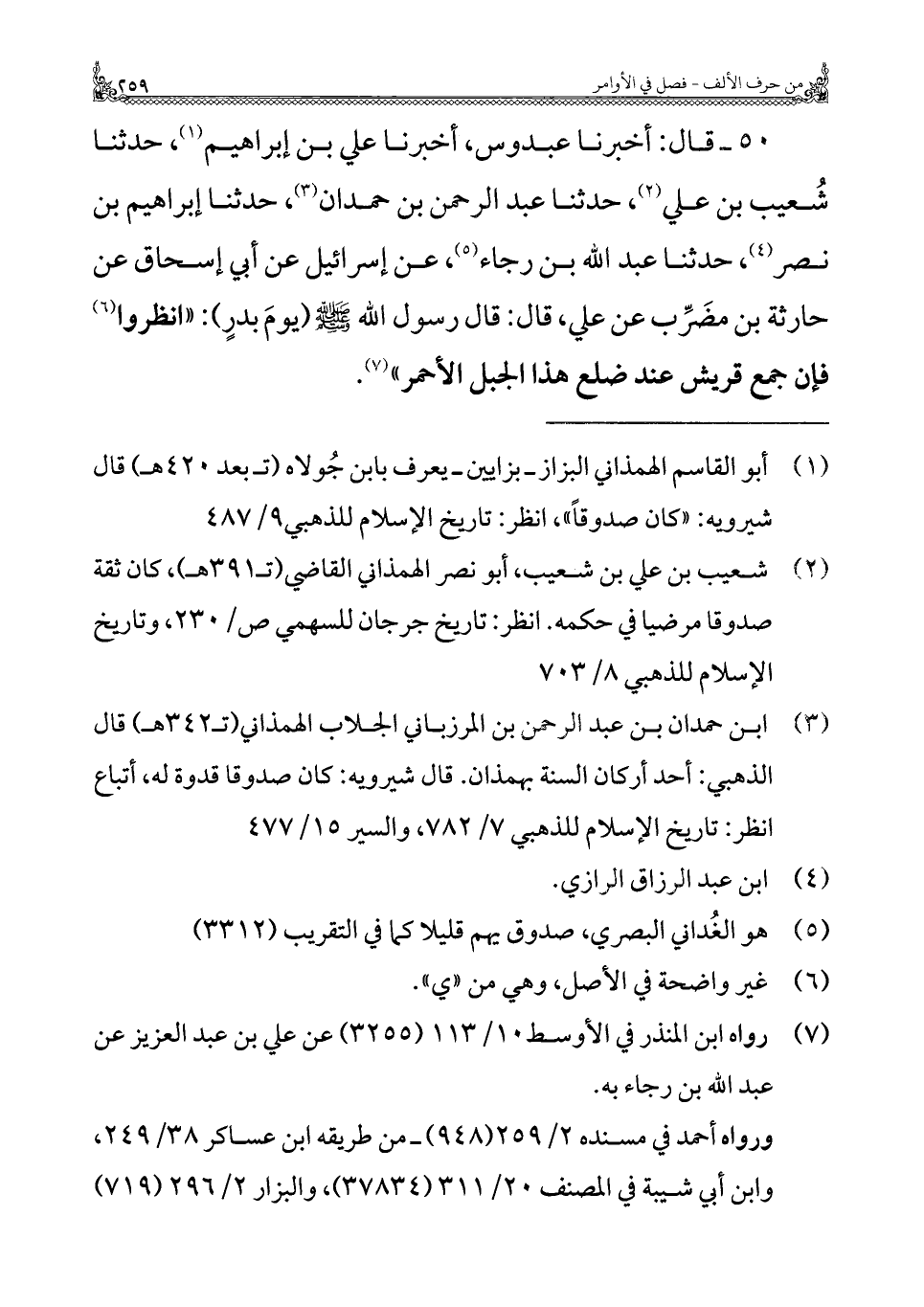 ٥٠ - قال: أخبر نا عبدوس، أخبرنا علي بن إبراهيم (¬١)، حَدَّثَنَا شُعيب بن علي (¬٢)، حَدَّثَنَا عبد الرحمن بن حمدان (¬٣)، حَدَّثَنَا إبراهيم بن نصر (¬٤)، حَدَّثَنَا عبد الله بن رجاء (¬٥)، عن إسرائيل عن أبي إسحاق عن حارثة بن مضَرِّب عن علي، قال: قال رسول الله - صَلَّى اللهُ عَلَيْهِ وَسَلَّمَ - (يومَ بدرٍ): "انظروا (¬٦) فإن جمع قريش عند ضلع هذا الجبل الأحمر" (¬٧).