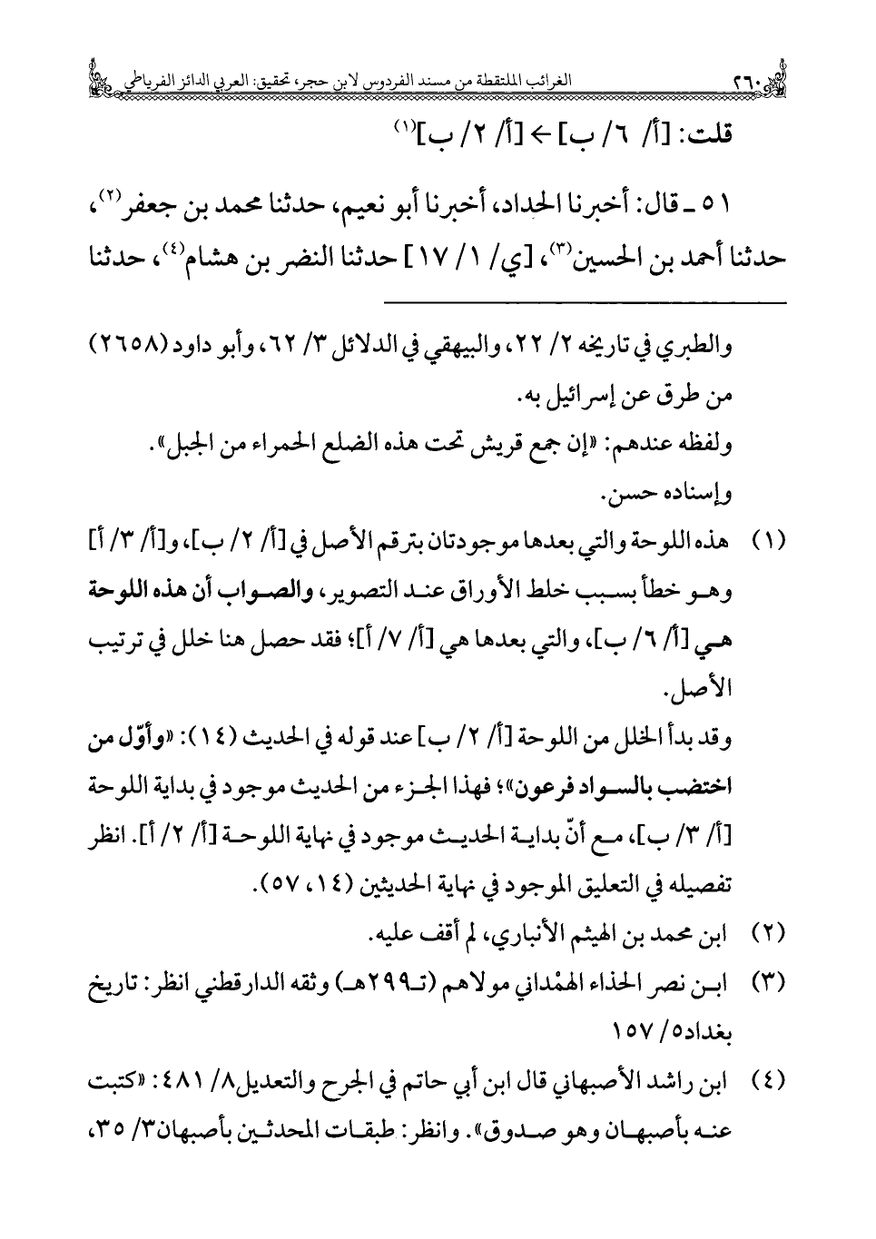 وقد بدأ الخلل من اللوحة [أ/٢/ب] عند قولُه فِي الحديث (١٤): "وأوّل من اختضب بالسواد فرعون"؛ فهذا الجزء من الحديث موجود فِي بداية اللوحة مع أنّ بداية الحديث موجود فِي نهاية اللوحة [أ/٢/أ]. انظر تفصيله فِي التعليق الموجود فِي نهاية الحديثين (١٤، ٥٧).