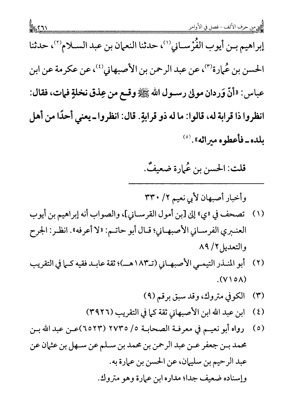 إبراهيم بن أَيُّوبَ الفُرْساني (¬١)، حَدَّثَنَا النعمان بن عبد السلام (¬٢)، حَدَّثَنَا الحسن بن عُمارة (¬٣)، عن عبد الرحمن بن الأصبهاني (¬٤)، عن عِكْرَمة عن ابن عَبَّاسٍ: "أنّ وَردان مولى رسول الله - صَلَّى اللهُ عَلَيْهِ وَسَلَّمَ - وقع من عِذق نخلةٍ فمات، فقال: انظروا ذا قرابة له، قالوا: ما له ذو قرابةٍ. قال: انظروا -يعني أحدًا من أهل بلده- فأعطوه ميراثه". (¬٥)