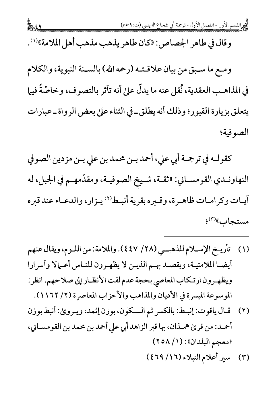 وقال في طاهر الجصاص: "كان طاهر يذهب مذهب أهل الملامة" (¬١).