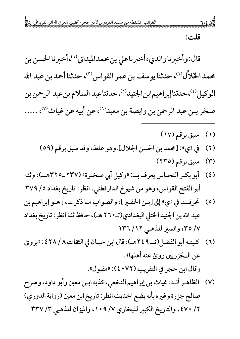 (¬٥) تحرفت في "ي" إلى [بن الحقير]، والصواب ما ذكرت، وهو إبراهيم بن عبد الله بن الجنيد الختلي البغدادي (ت ٢٦٠ هـ)، حافظ ثقة انظر: تاريخ بغداد ٧/ ٣٥، والسير للذهبي ١٢/ ١٣٦