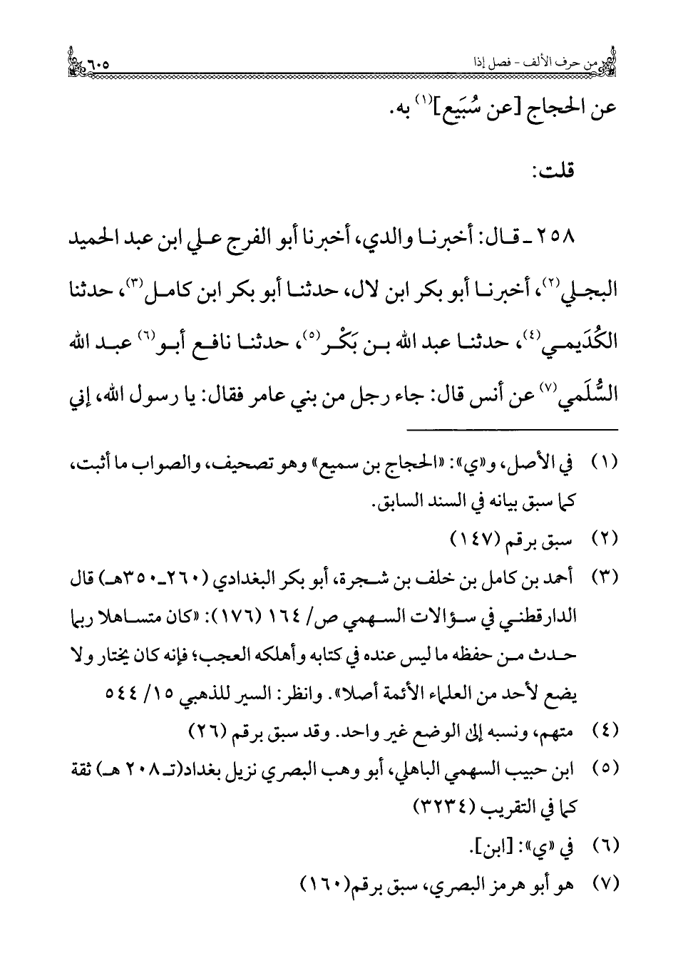 ٢٥٨ - قال: أخبرنا والدي، أخبرنا أبو الفرج علي ابن عبد الحميد البجلي (¬٢)، أخبرنا أبو بكر بن لال، حدثنا أبو بكر بن كامل (¬٣)، حدثنا الكُدَيمي (¬٤)، حدثنا عبد الله بن بَكْر (¬٥)، حدثنا نافع أبو (¬٦) عبد الله السُّلَمي (¬٧) عن أنس قال: جاء رجل من بني عامر فقال: يا رسول الله، إني