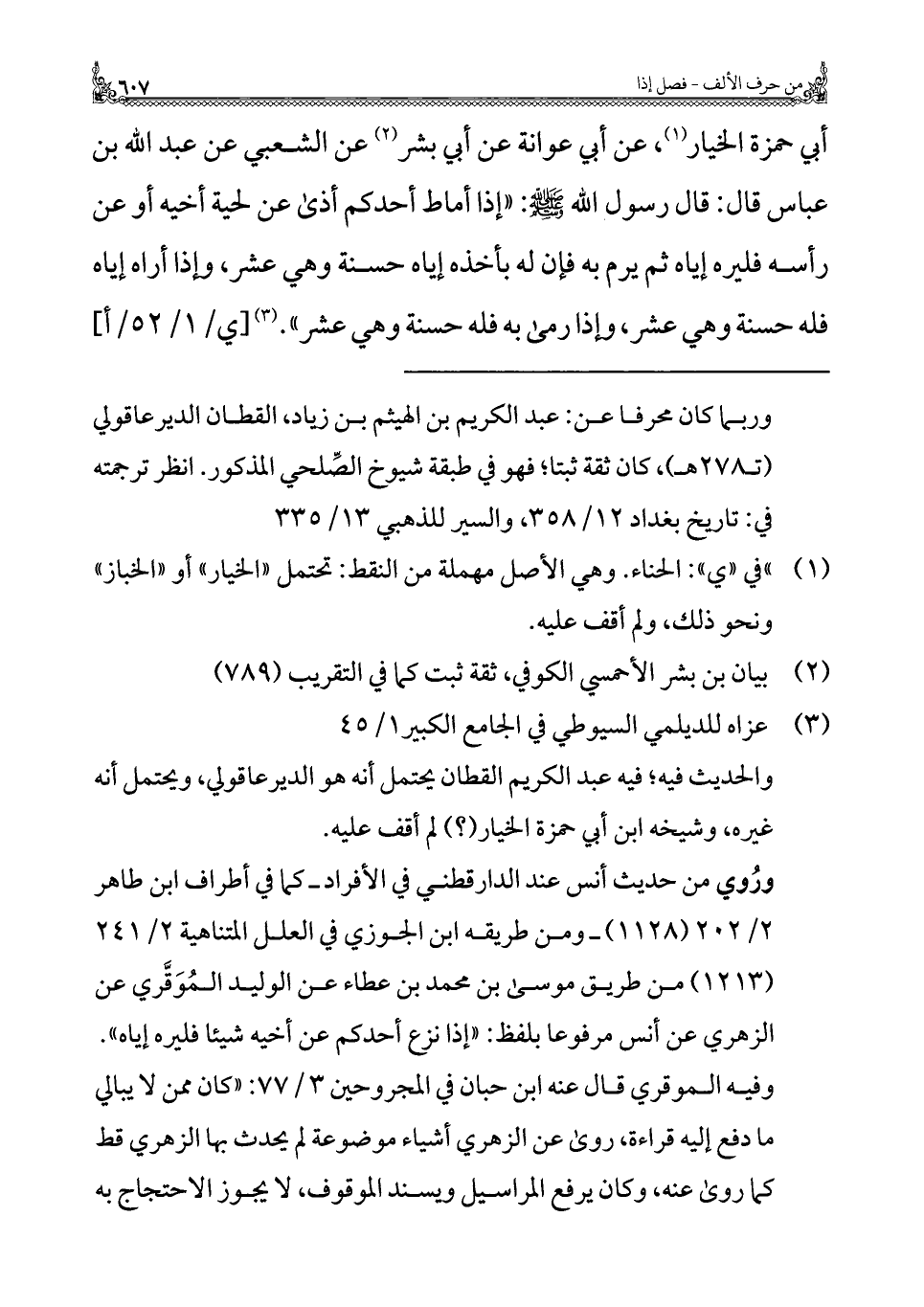 أبي حمزة الخيار (¬١)، عن أبي عوانة عن أبي بشر (¬٢) عن الشعبي عن عبد الله بن عباس قال: قال رسول الله - صلى الله عليه وسلم -: "إذا أماط أحدكم أذى عن لحية أخيه أو عن رأسه فليره إياه ثم يرم به فإن له بأخذه إياه حسنة وهي عشر، وإذا أراه إياه فله حسنة وهي عشر، وإذا رمى به فله حسنة وهي عشر". (¬٣)