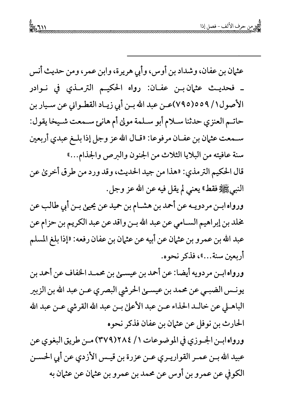 ورواه ابن مردويه عن أحمد بن هشام بن حميد عن يحيى بن أبي طالب عن مخلد بن إبراهيم السامي عن عبد الله بن واقد عن عبد الكريم بن حزام عن عبد الله بن عمرو بن عثمان عن أبيه عن عثمان بن عفان رفعه: "إذا بلغ المسلم أربعين سنة ... "، فذكر نحوه.