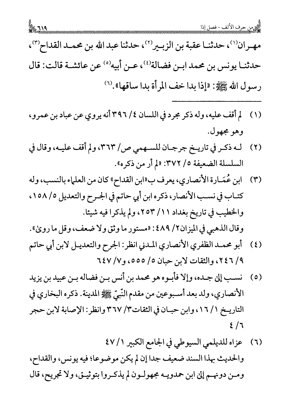 مهران (¬١)، حدثنا عقبة بن الزبير (¬٢)، حدثنا عبد الله بن محمد القداح (¬٣)، حدثنا يونس بن محمد ابن فضالة (¬٤)، عن أبيه (¬٥) عن عائشة قالت: قال رسول الله - صلى الله عليه وسلم -: "إذا بدا خف المرأة بدا ساقها". (¬٦)