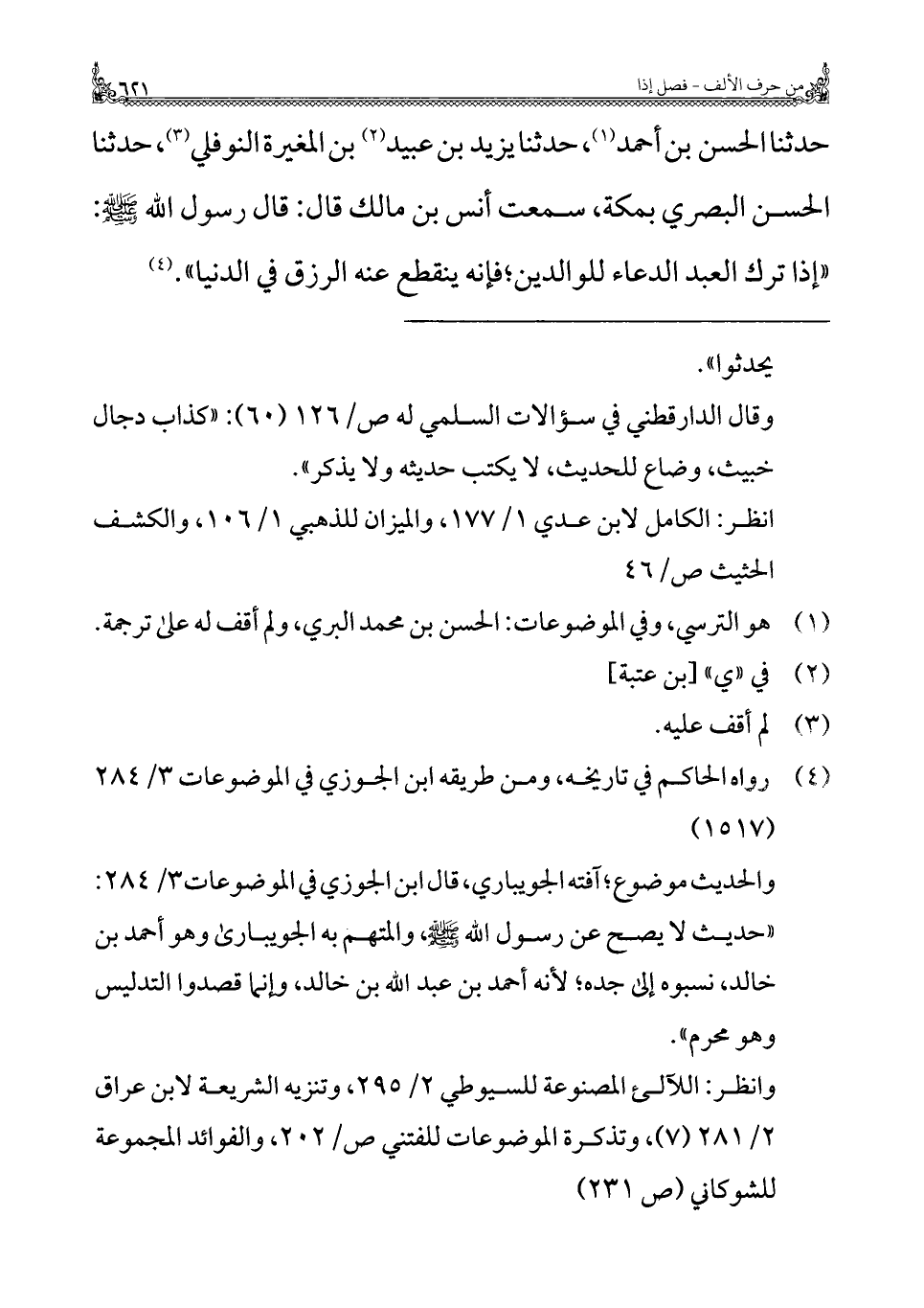 حدثنا الحسن بن أحمد (¬١)، حدثنا يزيد بن عبيد (¬٢) بن المغيرة النوفلي (¬٣)، حدثنا الحسن البصري بمكة، سمعت أنس بن مالك قال: قال رسول الله - صلى الله عليه وسلم -: "إذا ترك العبد الدعاء للوالدين؛ فإنه ينقطع عنه الرزق في الدنيا". (¬٤)