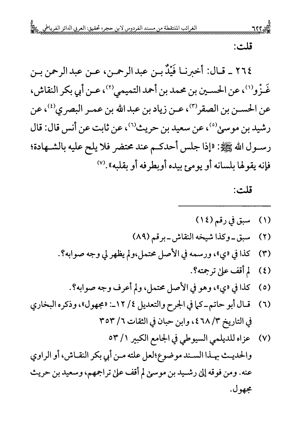 ٢٦٤ - قال: أخبرنا فَيْدٌ بن عبد الرحمن، عن عبد الرحمن بن غَزْو (¬١)، عن الحسين بن محمد بن أحمد التميمي (¬٢)، عن أبي بكر النقاش، عن الحسن بن الصقر (¬٣)، عن زياد بن عبد الله بن عمر البصري (¬٤)، عن رشيد بن موسى (¬٥)، عن سعيد بن حريث (¬٦)، عن ثابت عن أنس قال: قال رسول الله - صلى الله عليه وسلم -: "إذا جلس أحدكم عند محتضر فلا يلح عليه بالشهادة؛ فإنه يقولها بلسانه أو يومئ بيده أو بطرفه أو بقلبه". (¬٧)