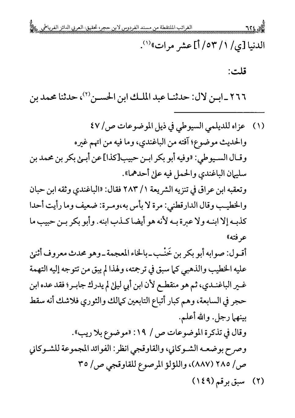وتعقبه ابن عراق في تنزيه الشريعة ١/ ٢٨٣ فقال: "الباغندي وثقه ابن حبان والخطيب وقال الدارقطني: مرة لا بأس به، ومرة: ضعيف وما رأيت أحدا كذبه إلا ابنه ولا عبرة به لأنه هو أيضًا كذب ابنه. وأبو بكر بن حبيب ما عرفته"