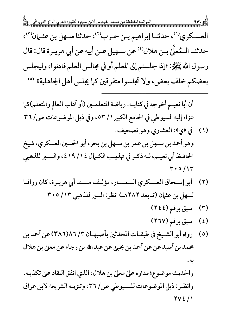 العسكري (١)، حدثنا إبراهيم بن حرب (¬٢)، حدثنا سهل بن عثمان (¬٣)، حدثنا المُعلَّى بن هلال (¬٤) عن سهيل عن أبيه عن أبي هريرة قال: قال رسول الله - صلى الله عليه وسلم -: "إذا جلستم إلى المعلم أو في مجالس العلم فادنوا، وليجلس بعضكم خلف بعض، ولا تجلسوا متفرقين كما يجلس أهل الجاهلية". (¬٥)