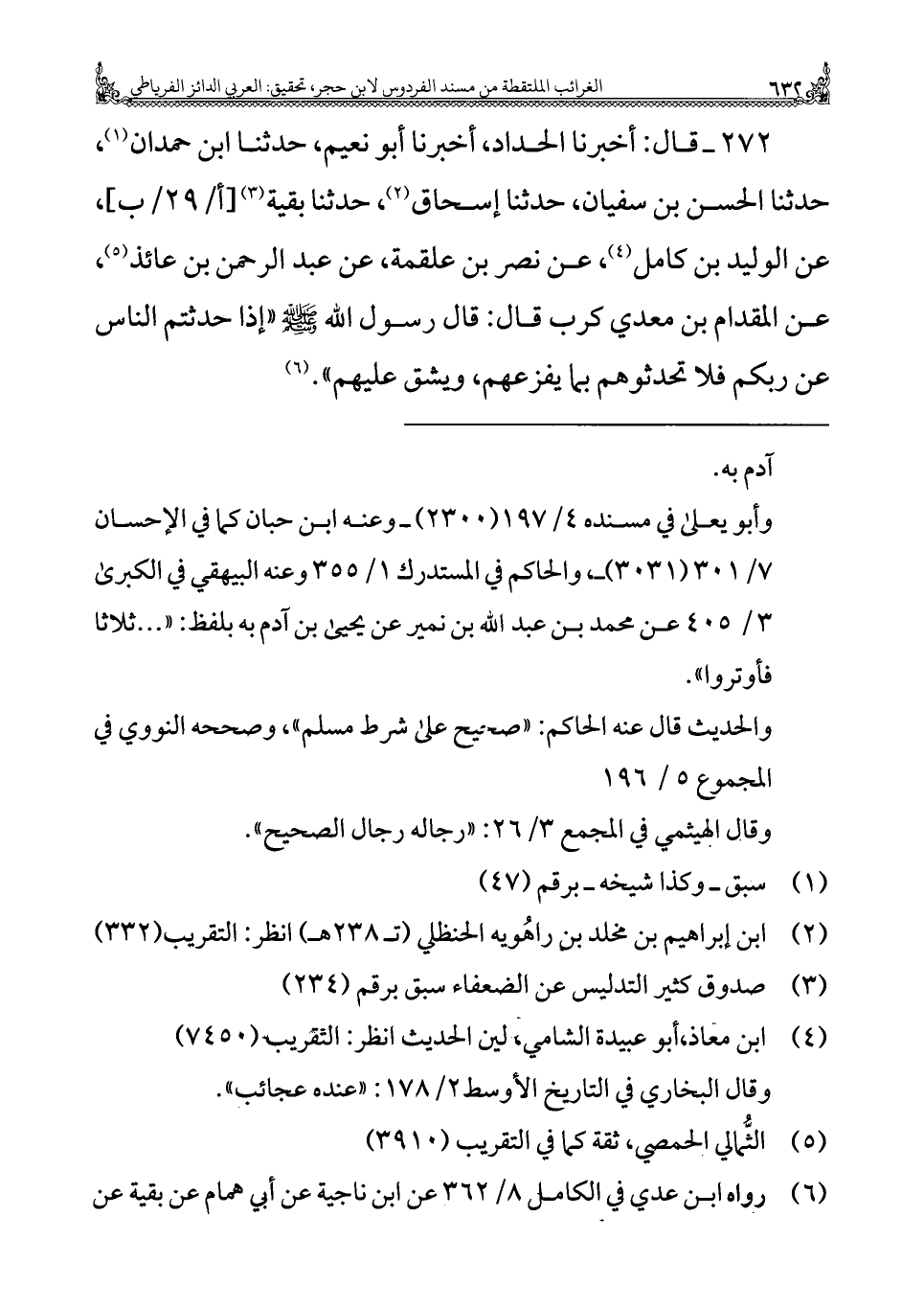 ٢٧٢ - قال: أخبرنا الحداد، أخبرنا أبو نعيم، حدثنا ابن حمدان (¬١)، حدثنا الحسن بن سفيان، حدثنا إسحاق (¬٢)، حدثنا بقية (¬٣)، عن الوليد بن كامل (¬٤)، عن نصر بن علقمة، عن عبد الرحمن بن عائذ (¬٥)، عن المقدام بن معدي كرب قال: قال رسول الله - صلى الله عليه وسلم - "إذا حدثتم الناس عن ربكم فلا تحدثوهم بما يفزعهم، ويشق عليهم". (¬٦)