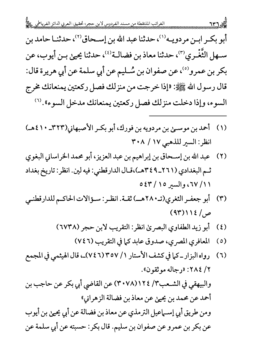 أبو بكر بن مردويه (¬١)، حدثنا عبد الله بن إسحاق (¬٢)، حدثنا حامد بن سهل الثَّغْري (¬٣)، حدثنا معاذ بن فضالة (¬٤)، حدثنا يحيى بن أيوب، عن بكر بن عمرو (¬٥)، عن صفوان بن سُليم عن أبي سلمة عن أبي هريرة قال: قال رسول الله - صلى الله عليه وسلم -: "إذا خرجت من منزلك فصل ركعتين يمنعانك مخرج السوء، وإذا دخلت منزلك فصل ركعتين يمنعانك مدخل السوء". (¬٦)