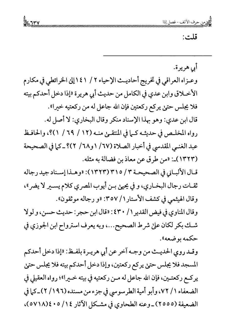وقد روي الحديث من وجه آخر عن أبي هريرة بلفظ: "إذا دخل أحدكم المسجد فلا يجلس حتى يركع ركعتين، وإذا دخل أحدكم بيته فلا يجلس حتى يركع ركعتين، فإن الله جاعل له من ركعتيه في بيته خيرا"؛ رواه العقيلي في الضعفاء ١/ ٧٢، وأبو أمية الطرسوسي في جزء من مسنده (١٩٦/ ٢) -كما في الضعيفة (٢٥٥٥) - وعنه الطحاوي في مشكل الآثار ١٤/ ٤٠٥ (٥٧١٨)، =
