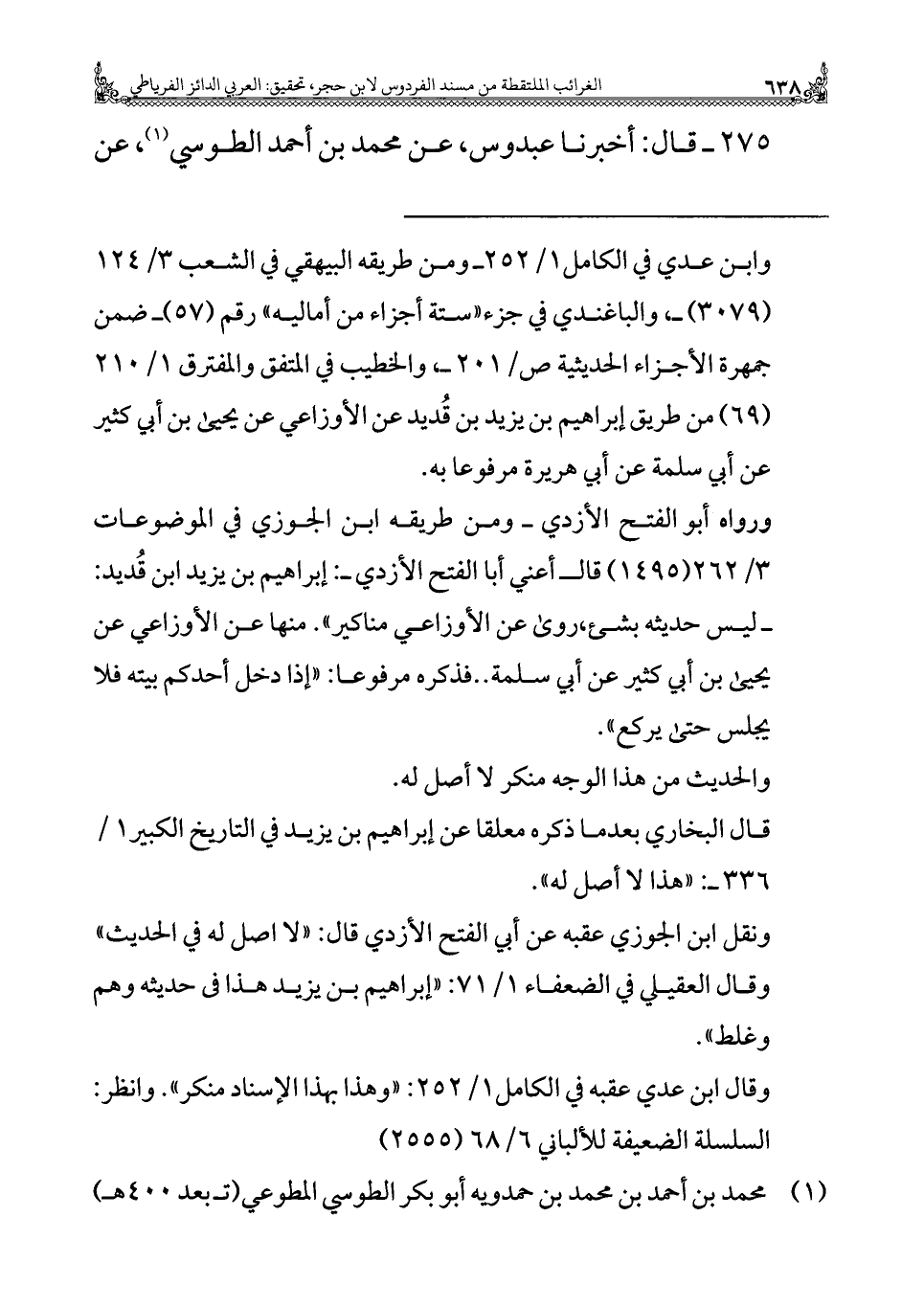 ورواه أبو الفتح الأزدي -ومن طريقه ابن الجوزي في الموضوعات ٣/ ٢٦٢ (١٤٩٥) قال -أعني أبا الفتح الأزدي-: إبراهيم بن يزيد ابن قُديد: -ليس حديثه بشئ، روى عن الأوزاعي مناكير". منها عن الأوزاعي عن يحيى بن أبي كثير عن أبي سلمة .. فذكره مرفوعا: "إذا دخل أحدكم بيته فلا يجلس حتى يركع".