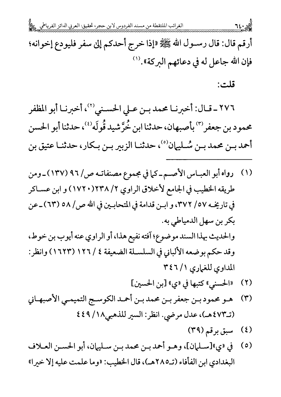 (¬٥) في "ي" [سلمان]، وهو أحمد بن محمد بن سليمان، أبو الحسن العلاف البغدادي ابن الفأفاء (ت ٢٨٥ هـ)، قال الخطيب: "وما علمت عليه إلا خيرا" =
