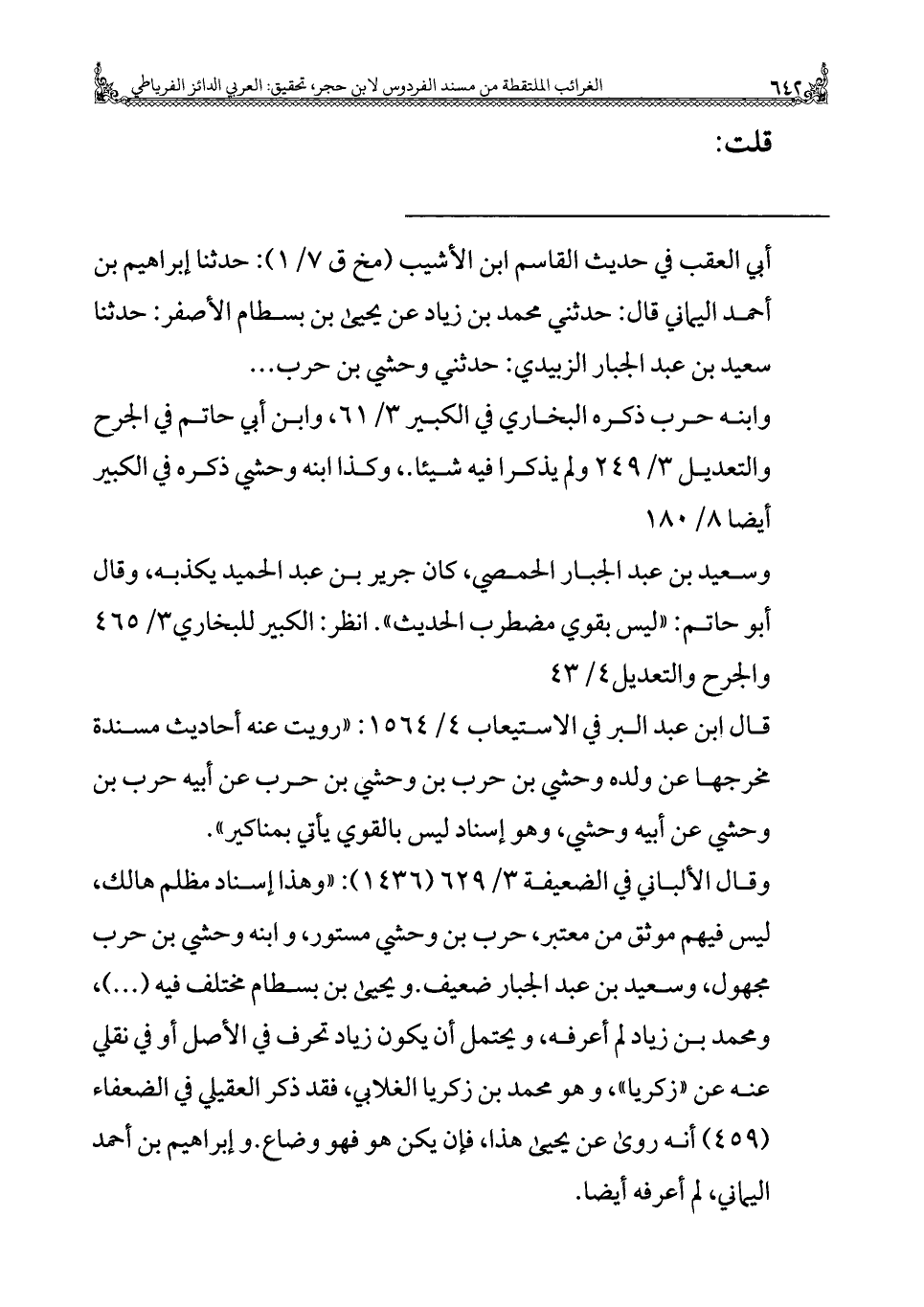 = أبي العقب في حديث القاسم ابن الأشيب (مخ ق ٧/ ١): حدثنا إبراهيم بن أحمد اليماني قال: حدثني محمد بن زياد عن يحيى بن بسطام الأصفر: حدثنا سعيد بن عبد الجبار الزبيدي: حدثني وحشي بن حرب ...