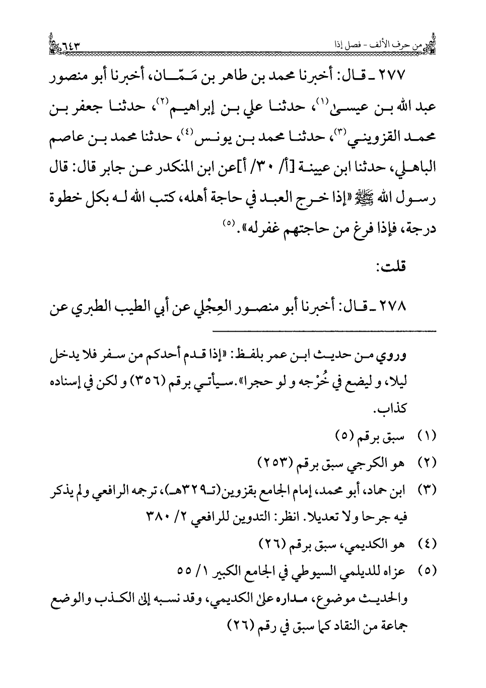 ٢٧٧ - قال: أخبرنا محمد بن طاهر بن مَمّان، أخبرنا أبو منصور عبد الله بن عيسى (¬١)، حدثنا علي بن إبراهيم (¬٢)، حدثنا جعفر بن محمد القزويني (¬٣)، حدثنا محمد بن يونس (¬٤)، حدثنا محمد بن عاصم الباهلي، حدثنا ابن عيينة عن ابن المنكدر عن جابر قال: قال رسول الله - صلى الله عليه وسلم - "إذا خرج العبد في حاجة أهله، كتب الله له بكل خطوة درجة، فإذا فرغ من حاجتهم غفر له". (¬٥)