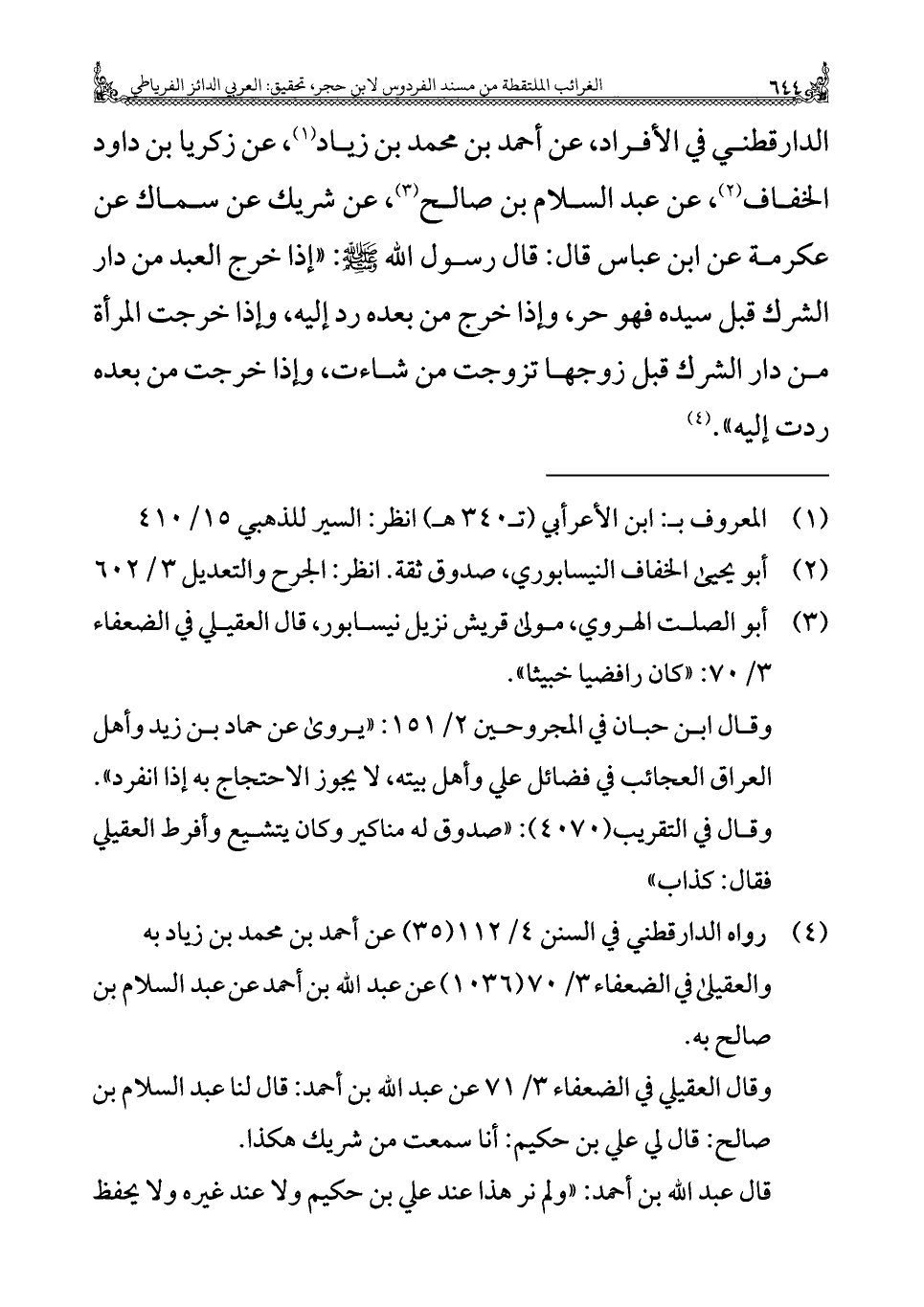 الدارقطني في الأفراد، عن أحمد بن محمد بن زياد (¬١)، عن زكريا بن داود الخفاف (¬٢)، عن عبد السلام بن صالح (¬٣)، عن شريك عن سماك عن عكرمة عن ابن عباس قال: قال رسول الله - صلى الله عليه وسلم -: "إذا خرج العبد من دار الشرك قبل سيده فهو حر، وإذا خرج من بعده رد إليه، وإذا خرجت المرأة من دار الشرك قبل زوجها تزوجت من شاءت، وإذا خرجت من بعده ردت إليه". (¬٤)