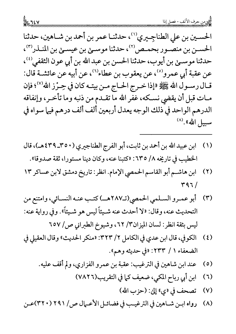 الحسين بن علي الطناجِيري (¬١)، حدثنا عمر بن أحمد بن شاهين، حدثنا الحسن بن منصور بحمص (¬٢)، حدثنا موسى بن عيسى بن المنذر (¬٣)، حدثنا موسى بن أيوب، حدثنا الحسن بن عبد الله بن أبي عون الثقفي (¬٤)، عن عقبة أبي عمرو (¬٥)، عن يعقوب بن عطاء (¬٦)، عن أبيه عن عائشة قال: قال رسول الله - صلى الله عليه وسلم - "إذا خرج الحاج من بيته كان في حِرْز الله (¬٧)؛ فإن مات قبل أن يقضي نسكه، غفر الله ما تقدم من ذنبه وما تأخر، وإنفاقه الدرهم الواحد في ذلك الوجه يعدل أربعين ألف ألف درهم فيما سواه في سبيل الله". (¬٨)
