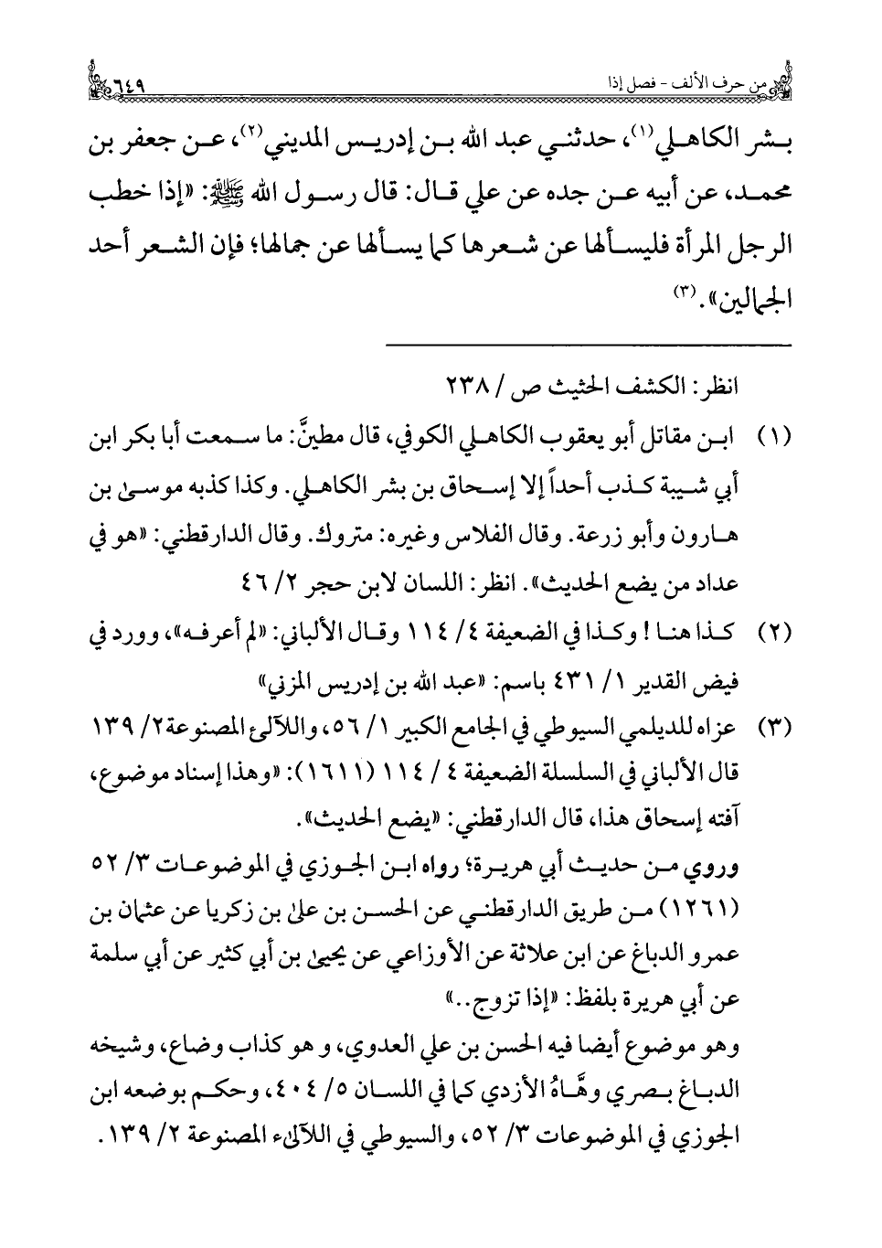 بشر الكاهلي (¬١)، حدثني عبد الله بن إدريس المديني (¬٢)، عن جعفر بن محمد، عن أبيه عن جده عن علي قال: قال رسول الله - صلى الله عليه وسلم -: "إذا خطب الرجل المرأة فليسألها عن شعرها كما يسألها عن جمالها؛ فإن الشعر أحد الجمالين". (¬٣)