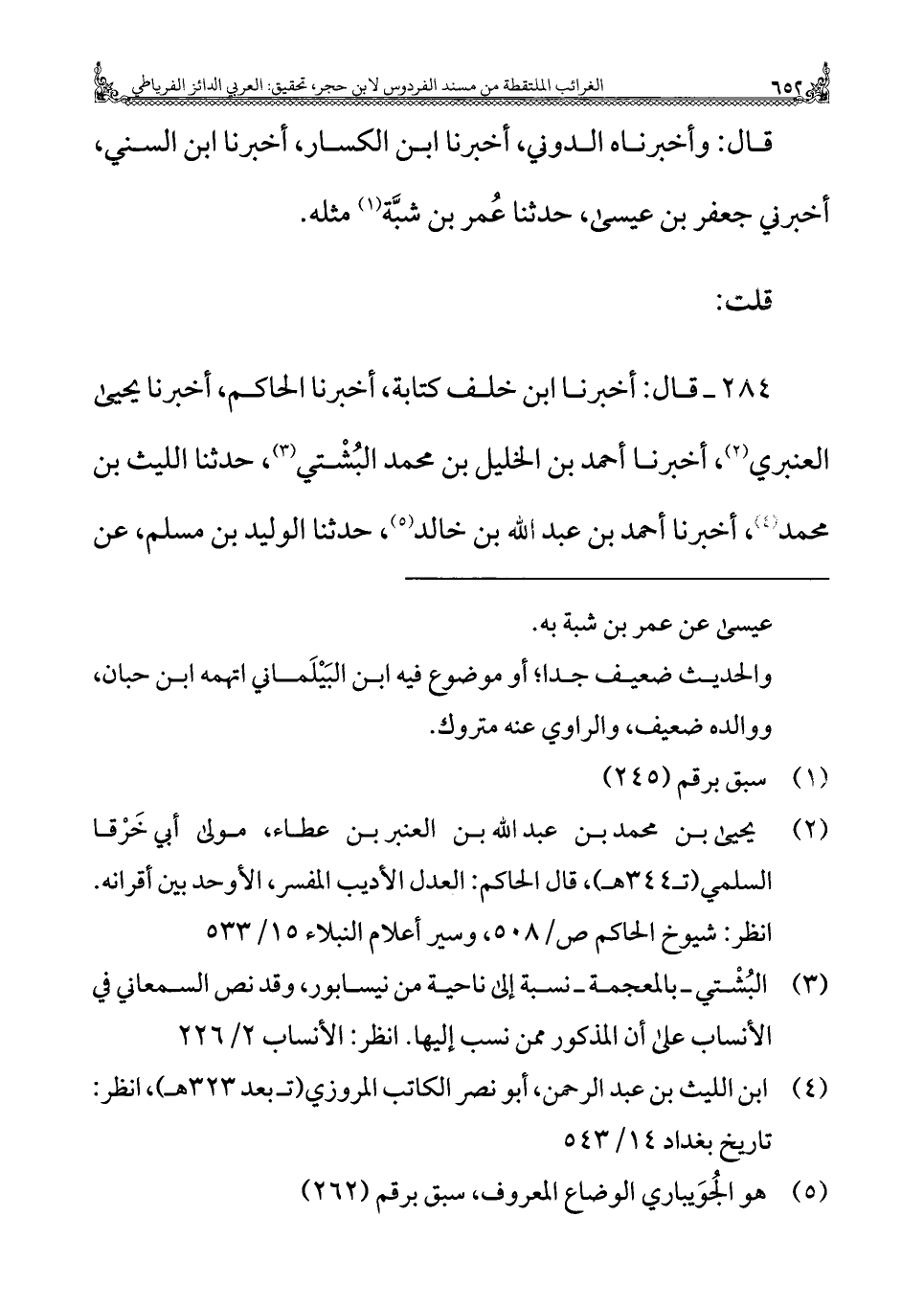 ٢٨٤ - قال: أخبرنا ابن خلف كتابة، أخبرنا الحاكم، أخبرنا يحيى العنبري (¬٢)، أخبرنا أحمد بن الخليل بن محمد البُشْتي (¬٣)، حدثنا الليث بن محمد (¬٤)، أخبرنا أحمد بن عبد الله بن خالد (¬٥)، حدثنا الوليد بن مسلم، عن