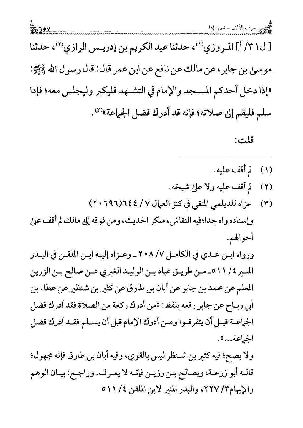 المروزي (¬١)، حدثنا عبد الكريم بن إدريس الرازي (¬٢)، حدثنا موسى بن جابر، عن مالك عن نافع عن ابن عمر قال: قال رسول الله - صلى الله عليه وسلم -: "إذا دخل أحدكم المسجد والإمام في التشهد فليكبر وليجلس معه؛ فإذا سلم فليقم إلى صلاته؛ فإنه قد أدرك فضل الجماعة" (¬٣).