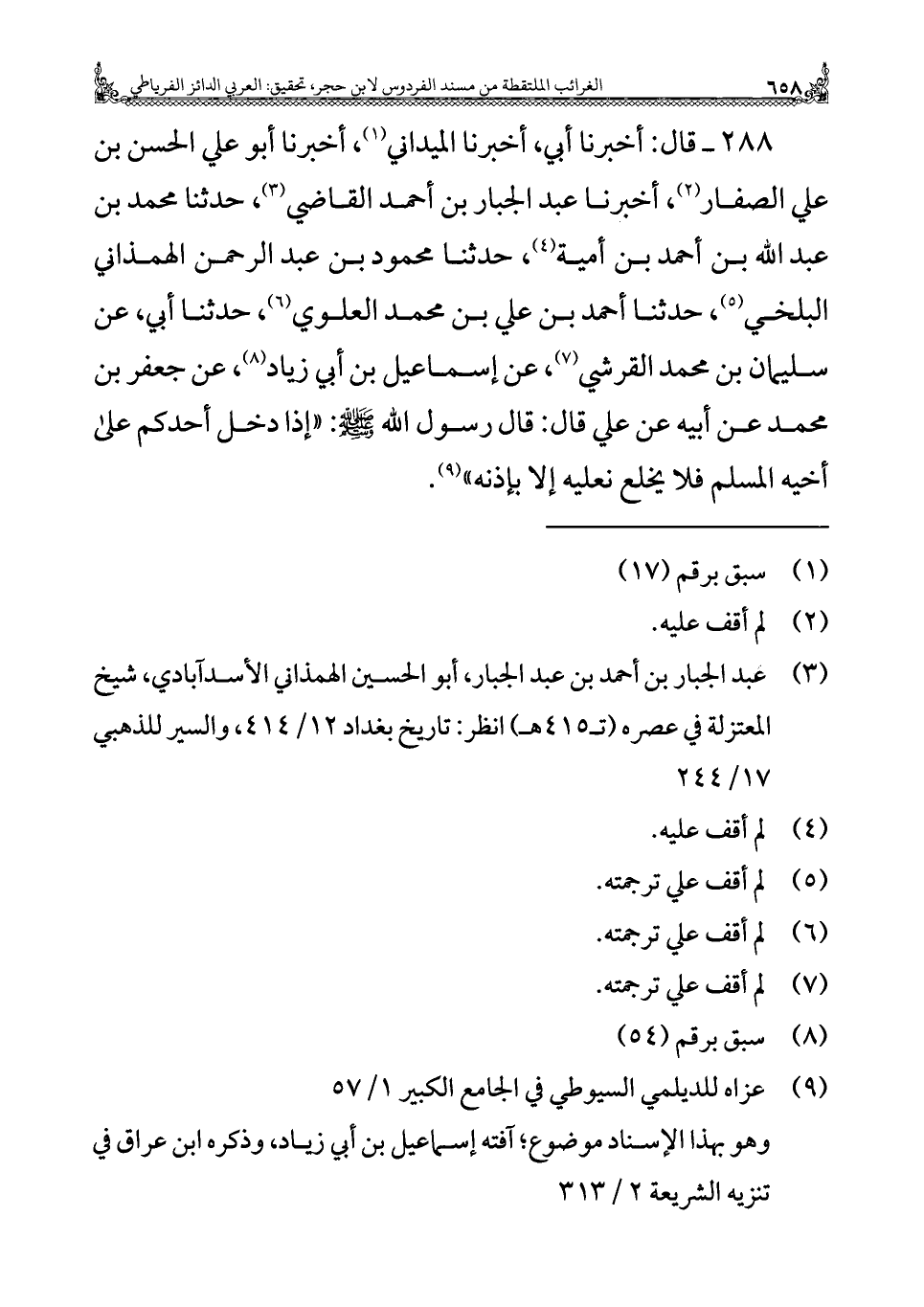٢٨٨ - قال: أخبرنا أبي، أخبرنا الميداني (¬١)، أخبرنا أبو علي الحسن بن علي الصفار (¬٢)، أخبرنا عبد الجبار بن أحمد القاضي (¬٣)، حدثنا محمد بن عبد الله بن أحمد بن أمية (¬٤)، حدثنا محمود بن عبد الرحمن الهمذاني البلخي (¬٥)، حدثنا أحمد بن علي بن محمد العلوي (¬٦)، حدثنا أبي، عن سليمان بن محمد القرشي (¬٧)، عن إسماعيل بن أبي زياد (¬٨)، عن جعفر بن محمد عن أبيه عن علي قال: قال رسول الله - صلى الله عليه وسلم -: "إذا دخل أحدكم على أخيه المسلم فلا يخلع نعليه إلا بإذنه" (¬٩).