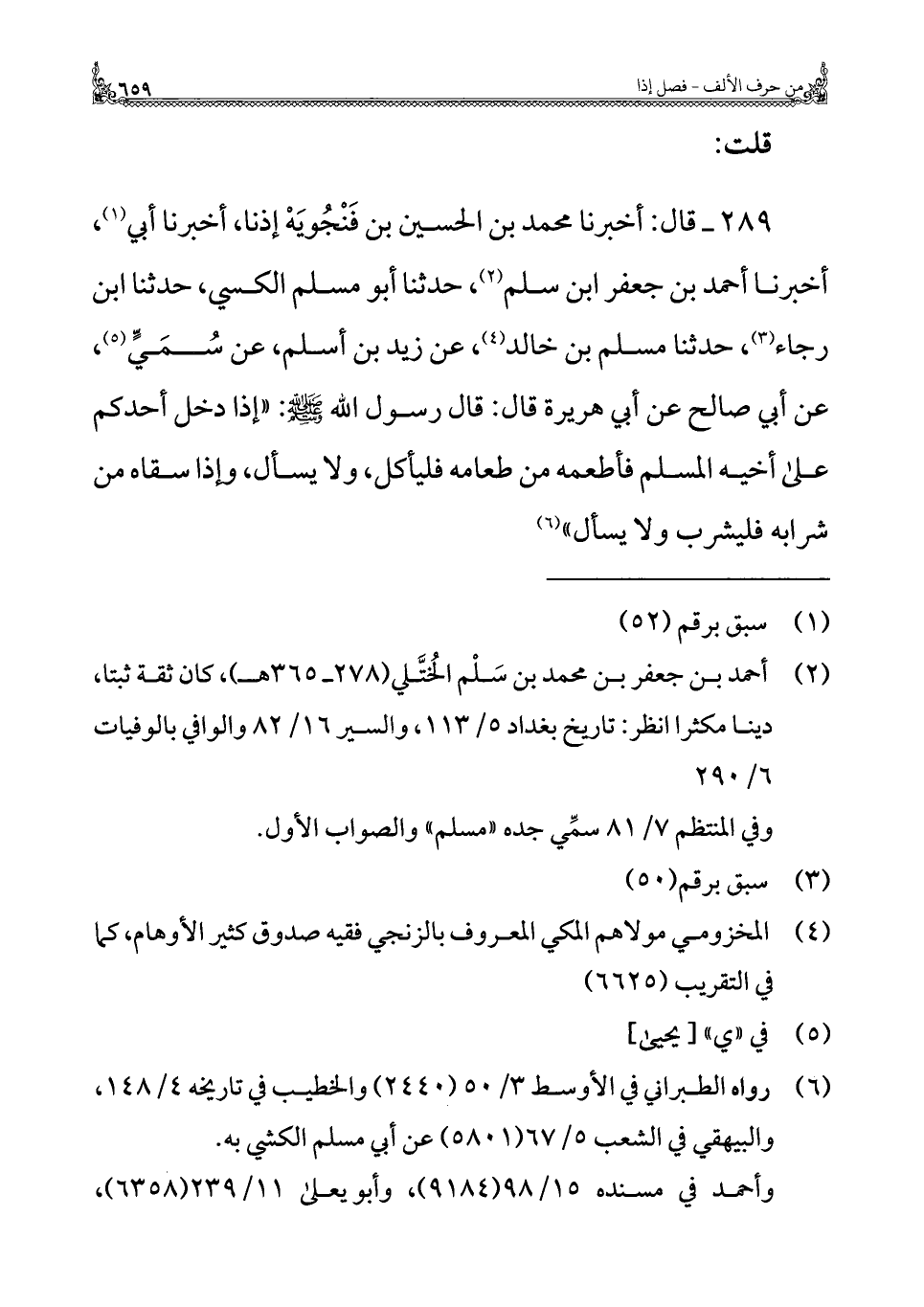 ٢٨٩ - قال: أخبرنا محمد بن الحسين بن فَنْجُويَهْ إذنا، أخبرنا أبي (¬١)، أخبرنا أحمد بن جعفر ابن سلم (¬٢)، حدثنا أبو مسلم الكسي، حدثنا ابن رجاء (¬٣)، حدثنا مسلم بن خالد (¬٤)، عن زيد بن أسلم، عن سُمَيٍّ (¬٥)، عن أبي صالح عن أبي هريرة قال: قال رسول الله - صلى الله عليه وسلم -: "إذا دخل أحدكم على أخيه المسلم فأطعمه من طعامه فليأكل، ولا يسأل، وإذا سقاه من شرابه فليشرب ولا يسأل" (¬٦)