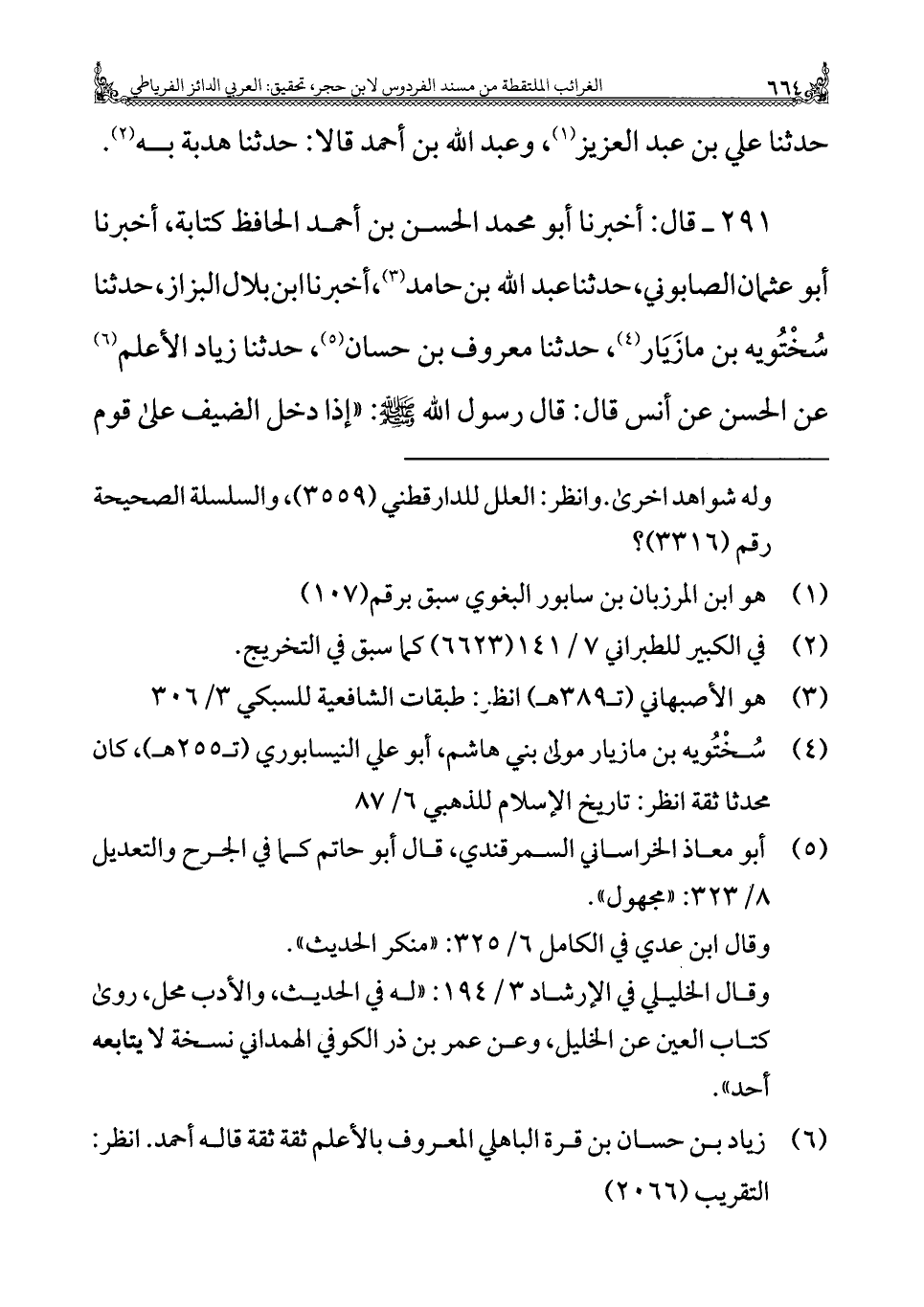 ٢٩١ - قال: أخبرنا أبو محمد الحسن بن أحمد الحافظ كتابة، أخبرنا أبو عثمان الصابوني، حدثنا عبد الله بن حامد (¬٣)، أخبرنا ابن بلال البزاز، حدثنا سُخْتُويه بن مازَيَار (¬٤)، حدثنا معروف بن حسان (¬٥)، حدثنا زياد الأعلم (¬٦) عن الحسن عن أنس قال: قال رسول الله - صلى الله عليه وسلم -: "إذا دخل الضيف على قوم